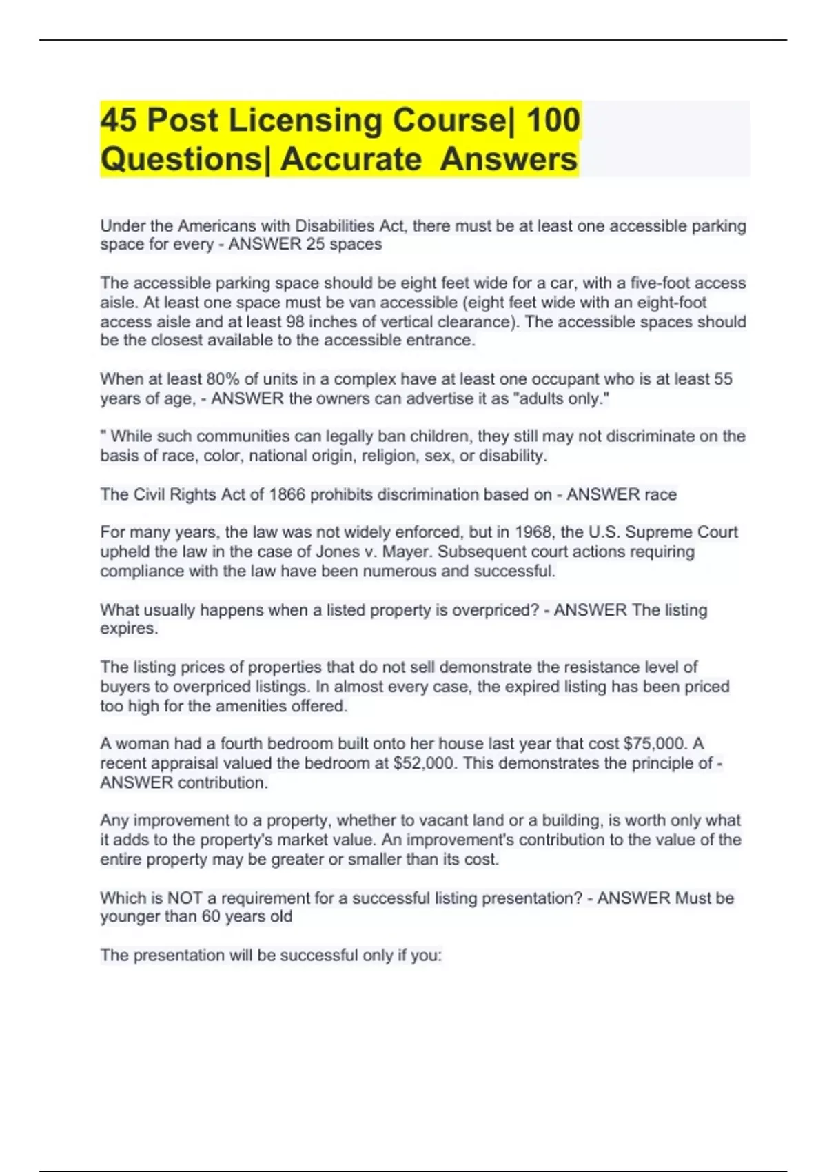 45 Post Licensing Course| 100 Questions| AccurateUnder the Americans with Disabilities Act, there must be at least one accessible parking space for every - ANSWER 25 spaces The accessible parking space should be eight feet wide for a car, with a five-foot access aisle. At least one space must be van accessible (eight feet wide with an eight-foot access aisle and at least 98 inches of vertical clearance). The accessible spaces should be the closest available to the accessible entrance. When at least 80% of units in a complex have at least one occupant who is at least 55 years of age, - ANSWER the owners can advertise it as "adults only." " While such communities can legally ban children, they still may not discriminate on the basis of race, color, national origin, religion, sex, or disability. The Civil Rights Act of 1866 prohibits discrimination based on - ANSWER race For many years, the law was not widely enforced, but in 1968, the U.S. Supreme Court upheld the law in the case of Jones v. Mayer. Subsequent court actions requiring compliance with the law have been numerous and successful. What usually happens when a listed property is overpriced? - ANSWER The listing expires. The listing prices of properties that do not sell demonstrate the resistance level of buyers to overpriced listings. In almost every case, the expired listing has been priced too high for the amenities offered. A woman had a fourth bedroom built onto her house last year that cost $75,000. A recent appraisal valued the bedroom at $52,000. This demonstrates the principle of - ANSWER contribution. Any improvement to a property, whether to vacant land or a building, is worth only what it adds to the property's market value. An improvement's contribution to the value of the entire property may be greater or smaller than its cost. Which is NOT a requirement for a successful listing presentation? - ANSWER Must be younger than 60 years old The presentation will be successful only if you: - know that all the parties who need to sign your listing are available; -are fully prepared to list the property, meaning you must have all the forms ready for signature when the parties agree to list; -know this presentation thoroughly; -know about the house you are trying to list by using the information you gathered from the tax appraiser's office, the plat books, or from your own personal inspection; -have prepared a CMA to help you show the sellers a fair value for their house and protect you from the overpriced listing—a nemesis that will cost you time and aggravation and make for unhappy customers; -have your information organized in a businesslike fashion and your mind organized, as well; -are properly dressed and professional in appearance and manner; and -are on time for the appointment. The sphere of influence is NOT - ANSWER a farm area. For a new sales associate, the sphere of influence is the best source of new listings and sales. Your sphere of influence will include family, friends, and past customers. A sales associate wants to earn at least $45,000 next year. If the average commission from listings sold is $3,000, how many listings must she sell in order to achieve that portion of her goals? - ANSWER 15 $45,000 ÷ $3,000 = 15 listings that must be sold. The components of a full title report are - ANSWER a survey, a physical inspection of the collateral, and a search of the records. The components of a full title report are a survey, a physical inspection of the collateral, and a search of the records to determine all the interests in a property. A sales associate, to test his understanding of what the customer has said, uses words th Answers