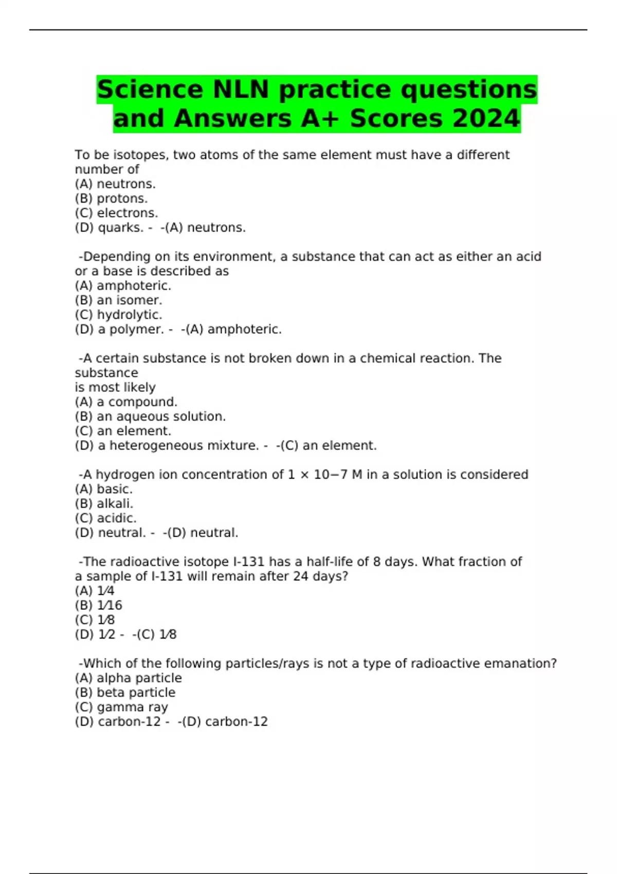 Science NLN practice questions and Answers A+ Scores 2024