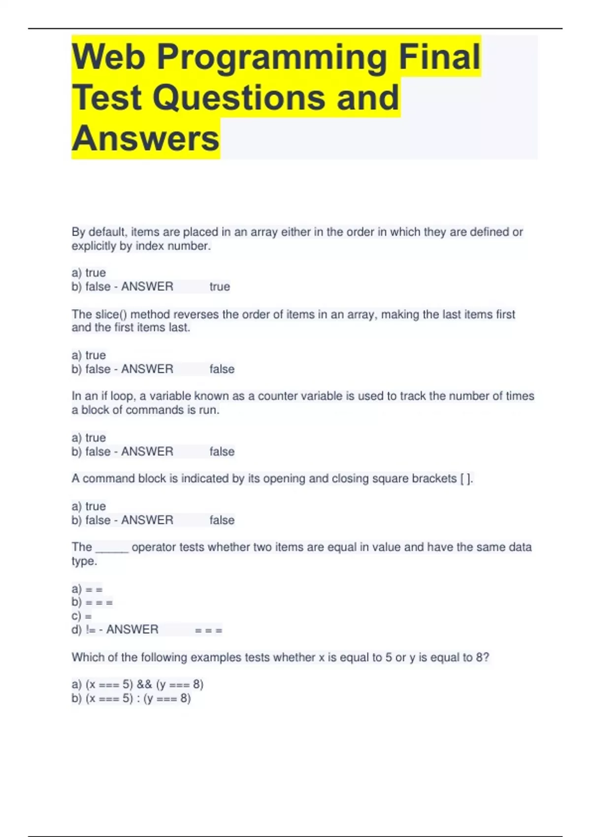 Web Programming Final Test Questions and Answers By default, items are placed in an array either in the order in which they are defined or explicitly by index number. a) true b) false - ANSWER true The slice() method reverses the order of items in an array, making the last items first and the first items last. a) true b) false - ANSWER false In an if loop, a variable known as a counter variable is used to track the number of times a block of commands is run. a) true b) false - ANSWER false A command block is indicated by its opening and closing square brackets [ ]. a) true b) false - ANSWER false The _____ operator tests whether two items are equal in value and have the same data type. a) = = b) = = = c) = d) != - ANSWER = = = Which of the following examples tests whether x is equal to 5 or y is equal to 8? a) (x === 5) && (y === 8) b) (x === 5) : (y === 8) Web Programming Final Test Questions and Answers c) (x === 5) || (y === 8) d) (x === 5) / (y === 8) - ANSWER c) (x === 5) || (y === 8) What is the output of the following code? var x = [4, 7, 11]; Each(stepUp); function stepUp(value, i, arr) { arr[i] = value + 1; } a) 4, 7, 11 b) 3, 7, 11 c) 5, 8, 12 d) 8, 14, 22 - ANSWER c) 5, 8, 12 Which of the following methods creates a new array populated with the elements of array that return a value of true from the callback function? a) (callback [, thisArg]) b) r(callback [, thisArg]) c) (callback [, thisArg]) d) (callback [, thisArg]) - ANSWER b) r(callback [, thisArg]) Identify a true statement of (callback [, thisArg]) method. a) It tests whether the condition returned by the callback function holds for at least one item in array. b) It returns the value of the first element in the array that passes a test in the callback function. c) It tests whether the condition returned by the callback function holds for all items in array. d) It returns the index of the first element in the array that passes a test in the callback function. - ANSWER a) It tests whether the condition returned by the callback function holds for at least one item in array. Web Programming Final Test Questions and Answers Identify a true statement of (callback [, thisArg]) method. a) It tests whether the condition returned by the callback function holds for at least one item in array. b) It returns the value of the first element in the array that passes a test in the callback function. c) It tests whether the condition returned by the callback function holds for all items in array. d) It returns the index of the first element in the array that passes a test in the callback function. - ANSWER b) It returns the value of the first element in the array that passes a test in the callback function. Which of the following statements is used to terminate any program loop or conditional statement? a) for b) while c) pass d) break - ANSWER d) break Identify the syntax of the statement label. a) label = {statements} b) statement!(label) c) label: statements d) - ANSWER c) label: statements