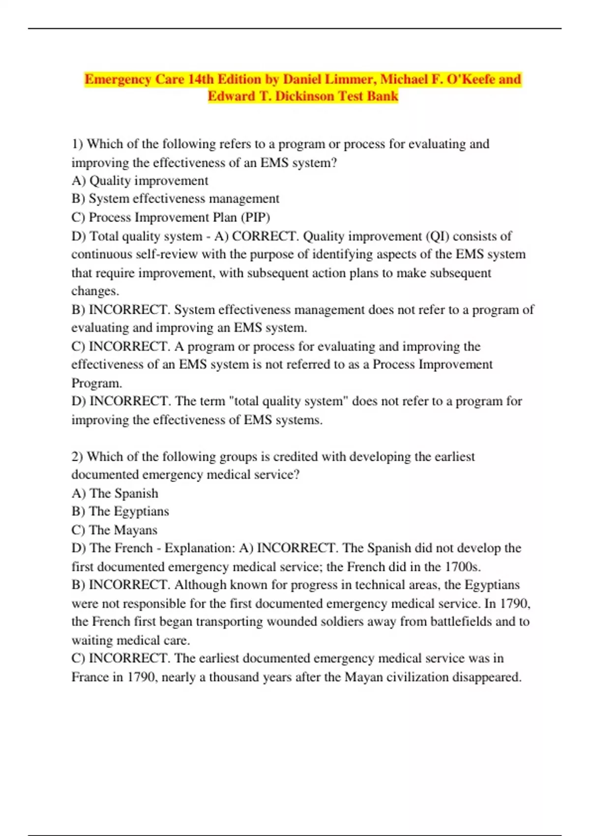 Test Bank Emergency Care 14th Edition by Daniel Limmer, Michael F. O'Keefe and Edward T. Dickinson Test Bank Which of the following refers to a program or process for evaluating and improving the effectiveness of an EMS system? A) Quality improvement B) System effectiveness management C) Process Improvement Plan (PIP) D) Total quality system - A) CORRECT. Quality improvement (QI) consists of continuous self-review with the purpose of identifying aspects of the EMS system that require improvement, with subsequent action plans to make subsequent changes. B) INCORRECT. System effectiveness management does not refer to a program of evaluating and improving an EMS system. C) INCORRECT. A program or process for evaluating and improving the effectiveness of an EMS system is not referred to as a Process Improvement Program. D) INCORRECT. The term "total quality system" does not refer to a program for improving the effectiveness of EMS systems. 2) Which of the following groups is credited with developing the earliest documented emergency medical service? A) The Spanish B) The Egyptians C) The Mayans D) The French - Explanation: