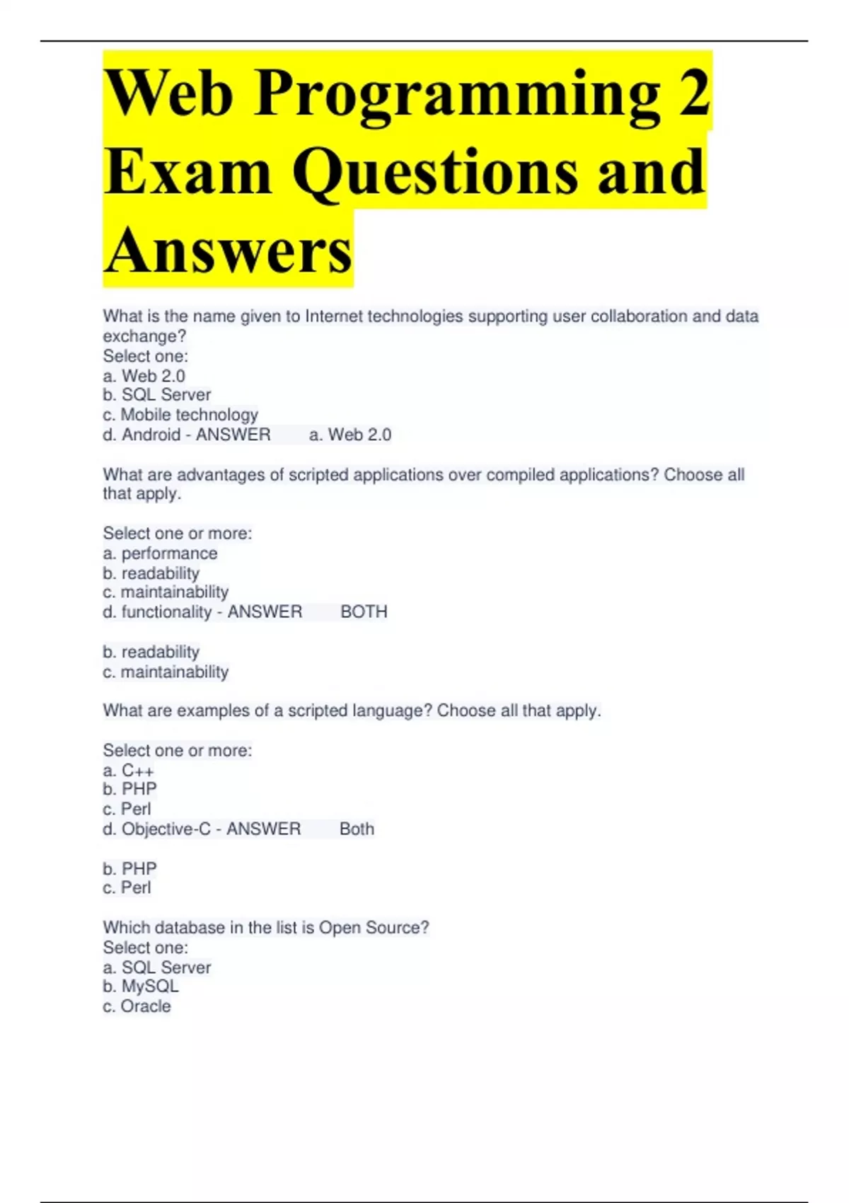 Web Programming 2 Exam Questions and Answers What is the name given to Internet technologies supporting user collaboration and data exchange? Select one: a. Web 2.0 b. SQL Server c. Mobile technology d. Android - ANSWER a. Web 2.0 What are advantages of scripted applications over compiled applications? Choose all that apply. Select one or more: a. performance b. readability c. maintainability d. functionality - ANSWER BOTH b. readability c. maintainability What are examples of a scripted language? Choose all that apply. Select one or more: a. C++ b. PHP c. Perl d. Objective-C - ANSWER Both b. PHP c. Perl Which database in the list is Open Source? Select one: a. SQL Server b. MySQL c. Oracle Web Programming 2 Exam Questions and Answers d. Apache - ANSWER b. MySQL What is a good example of static Internet content? Select one: a. CNN news page b. Yahoo home page c. Facebook Wall d. None of the above - ANSWER None of the above True or False: Most of the web sites today are Web 2.0. Select one: True False - ANSWER True True or False: Server-side programming allows users to login to web sites and generate content each time the page is visited. Select one: True False - ANSWER True True or False: Server-side programming uses some of the same languages as clientside (workstation) programming. Select one: True False - ANSWER True Select an example of a server-side programming language: Select one: a. JavaScript b. Perl c. HTML d. CSS - ANSWER Perl The speed of writing server code is increased when: Select one: a. The developer receives immediate feedback upon making changes Web Programming 2 Exam Questions and Answers b. The software is compiled before it is executed c. The developer uses discussion forums to debug code d. The software interpreted and error reporting is turned off - ANSWER a. The developer receives immediate feedback upon making changes What program can be used on a Windows computer to access a command prompt on a Unix/Linux server? Select one: a. b. SQL Server c. cmd d. Internet Explorer - ANSWER a. What commands can be used on a Linux server? Select one or more: a. b. ls c. make d. Click on Start button - ANSWER BOTH b. ls c. make Which system is an example of an Open Source database? Select one: a. SQL Server b. MySQL c. Oracle d. Apache - ANSWER b. MySQL