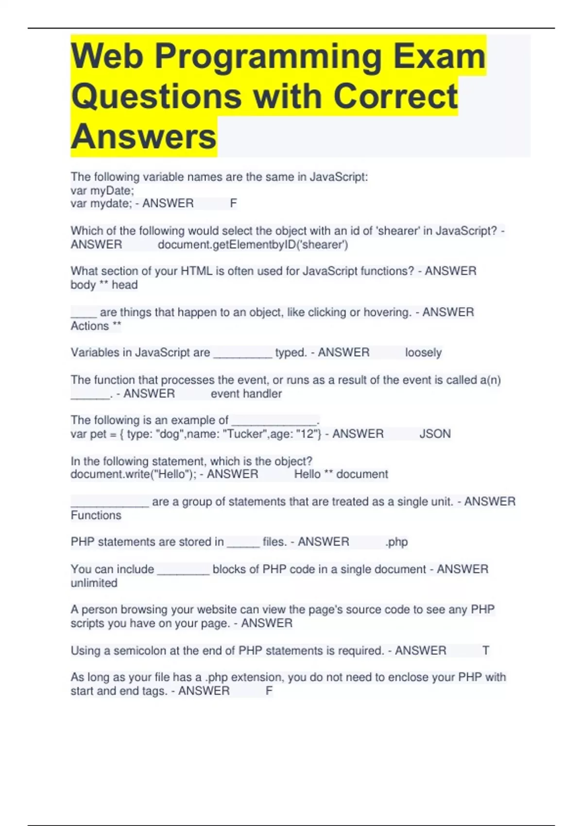 Web Programming Exam Questions with Correct Answers The following variable names are the same in JavaScript: var myDate; var mydate; - ANSWER F Which of the following would select the object with an id of 'shearer' in JavaScript? - ANSWER ElementbyID('shearer') What section of your HTML is often used for JavaScript functions? - ANSWER body ** head ____ are things that happen to an object, like clicking or hovering. - ANSWER Actions ** Variables in JavaScript are _________ typed. - ANSWER loosely The function that processes the event, or runs as a result of the event is called a(n) ______. - ANSWER event handler The following is an example of _____________. var pet = { type: "dog",name: "Tucker",age: "12"} - ANSWER JSON In the following statement, which is the object? ("Hello"); - ANSWER Hello ** document ____________ are a group of statements that are treated as a single unit. - ANSWER Functions PHP statements are stored in _____ files. - ANSWER .php You can include ________ blocks of PHP code in a single document - ANSWER unlimited A person browsing your website can view the page's source code to see any PHP scripts you have on your page. - ANSWER Using a semicolon at the end of PHP statements is required. - ANSWER T As long as your file has a .php extension, you do not need to enclose your PHP with start and end tags. - ANSWER F Web Programming Exam Questions with Correct Answers PHP is a ________ language. - ANSWER server-side To end a PHP script, use ___________ - ANSWER ?> To write multiple lines of code as a comment in PHP, you'd use which of the following formats? - ANSWER /* Comment line1 Comment line 2 */ PHP's print() and echo statements do the same thing. - ANSWER T The __________ statement is used to display output on the page in PHP. - ANSWER echo The document object is a ____________ of the window object. - ANSWER child