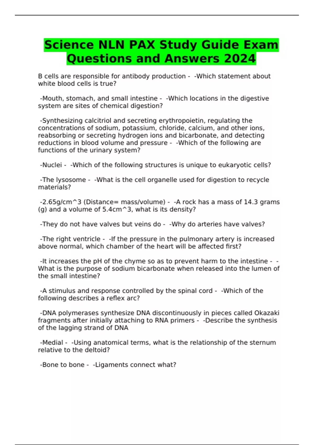 Science NLN PAX Study Guide Exam Questions and Answers 2024