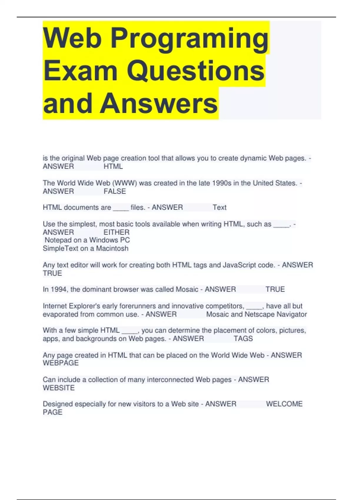 Web Programing Exam Questions and Answers is the original Web page creation tool that allows you to create dynamic Web pages. - ANSWER HTML The World Wide Web (WWW) was created in the late 1990s in the United States. - ANSWER FALSE HTML documents are ____ files. - ANSWER Text Use the simplest, most basic tools available when writing HTML, such as ____. - ANSWER EITHER Notepad on a Windows PC SimpleText on a Macintosh Any text editor will work for creating both HTML tags and JavaScript code. - ANSWER TRUE In 1994, the dominant browser was called Mosaic - ANSWER TRUE Internet Explorer's early forerunners and innovative competitors, ____, have all but evaporated from common use. - ANSWER Mosaic and Netscape Navigator With a few simple HTML ____, you can determine the placement of colors, pictures, apps, and backgrounds on Web pages. - ANSWER TAGS Any page created in HTML that can be placed on the World Wide Web - ANSWER WEBPAGE Can include a collection of many interconnected Web pages - ANSWER WEBSITE Designed especially for new visitors to a Web site - ANSWER WELCOME PAGE Web Programing Exam Questions and Answers A targeted "welcome" page used by Web advertisers - ANSWER LANDING PAGE The main or primary Web page for a corporation, organization, or individual - ANSWER HOME PAGE The tag that indicates the beginning of a paragraph is the ____ tag. - ANSWER <p> By using ____ tags, you can link to another place within your own document, link to a Web page anywhere on the Web, or link to another Web page on your own computer. - ANSWER anchor When you see https://, the "s" stands for ____. - ANSWER secure To change the background color of your page, you can add the background ____. - ANSWER attribute Used in HTML to indicate a special quality - ANSWER attribute Downgraded, devalued, or made obsolete - ANSWER deprecated Used to navigate to another Web site or a place within the current Web site - ANSWER hyperlink Web developers follow these so that Web pages display properly - ANSWER standards Used in HTML to indicate a definition of the attribute - ANSWER value