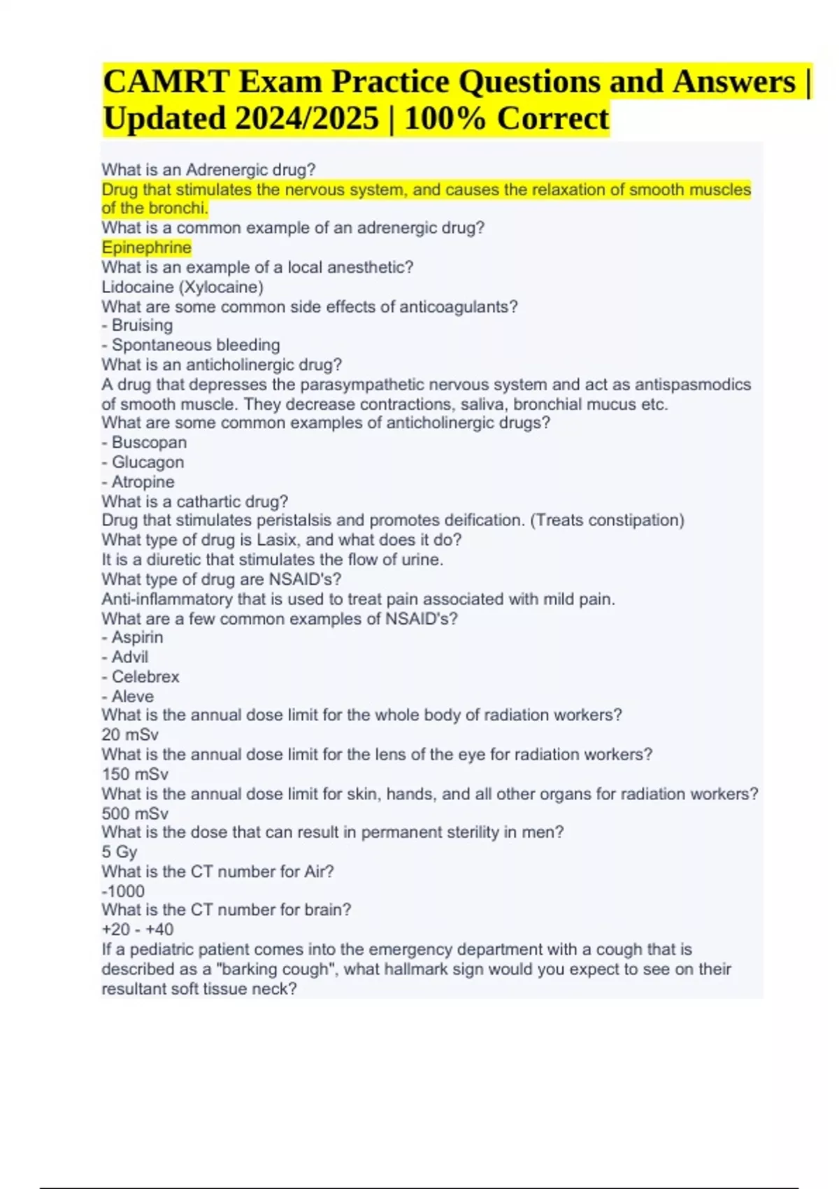 CAMRT Exam Practice Questions and Answers Latest Updated 2024/2025 (100% Correct) What is an anticholinergic drug? A drug that depresses the parasympathetic nervous system and act as antispasmodics of smooth muscle. They decrease contractions, saliva, bronchial mucus etc. What are some common examples of anticholinergic drugs? - Buscopan - Glucagon - Atropine What is a cathartic drug? Drug that stimulates peristalsis and promotes deification. (Treats constipation) What type of drug is Lasix, and what does it do? It is a diuretic that stimulates the flow of urine. What type of drug are NSAID's? Anti-inflammatory that is used to treat pain associated with mild pain. What are a few common examples of NSAID's? - Aspirin - Advil - Celebrex - Aleve What is the annual dose limit for the whole body of radiation workers? 20 mSv What is the annual dose limit for the lens of the eye for radiation workers? 150 mSv What is the annual dose limit for skin, hands, and all other organs for radiation workers? 500 mSv What is the dose that can result in permanent sterility in men? 5 Gy What is the CT number for Air? -1000 What is the CT number for brain? +20 - +40 If a pediatric patient comes into the emergency department with a cough that is described as a "barking cough", what hallmark sign would you expect to see on their resultant soft tissue neck? CAMRT Exam Practice Questions and Answers | Updated 2024/2025 | 100% Correct An hourglass or steeple sign What respiratory pathology is associated with the "bat wing or butterfly sign"? Pulmonary Edema In a tension pneumothorax, what way will the mediastinal structures deviate, and what way will the trachea deviate? The mediastinal structures will deviate away from the side of the pneumothorax and the trachea will deviate away as well. What contrast phase is used for a routine chest CT? Late arterial / bolus What is the average window width/window level for the brain? 190/50 What is the average window width/ window level for mediastinal structures? 325/50 In CT, what does your window width control? Number of shades of grey (CONTRAST) In CT, what does the window level control? The center of the grey scale (BRIGHTNESS / DARKNESS) What is the average timing for a delayed (equilibrium) scan? 300s What is the average timing for a Portal Venous (Equilibrium) scan? 65-85s What is the average timing for a Early Arterial (bolus) scan? 15-25s What is the average timing for a Late Arterial scan? 35-45s Which pathology would you see an air bronchogram on a plain film CXR? Alveolar pneumonia Which respiratory pathology would represent with the "tree-in-bud" appearance on a CT scan of the chest? Bronchopnemonia What are some of the signs and symptoms of Epiglottitis? - Stridor - Cyanosis - Fever - Drooling - Difficulty swallowing and breathing What are some of the hallmark symptoms of a patient with cystic fibrosis? - Sinusitis with polyps - Weightloss and large foul stool - Mucous in intestines - Excessive sweating What is one of the ways that they can test for cystic fibrosis? The sweat test How would you position a patient for a decubitus chest when the doctor is querying a pleural effusion in the right lung? Right lateral decubitus (affected side down) What is one of the hallmark signs of achlasia of the GI system? "Rat tail" or "Beak" sign What is the radiographic appearance of esophageal varices? - Worm tracings - rosary beads How will the radial tuberosity appear on a lateral elbow projection if the hand is externally rotated? The tuberosity will appear anterior How will the radial tuberosity appear on a lateral elbow projection if the hand is internally rotated? The tuberosity will appear posterior If during a lateral elbow projection, the patients proximal humerus is elevated, what will the resultant x-ray show? - The radial head will be posterior on the coranoid - The distal capitulum surface is too distal to the distal surface of the medial trochlea If during a lateral elbow projection, the patients proximal humerus is depresses, what will the resultant x-ray show? - The radial head will be anterior to the coranoid - The distal capitulum surface is demonstrated too far proximal to the medial trochlear surface If during a lateral elbow projection, the patients distal forearm is elevated, what will the resultant x-ray show? - The radial head will be proximal to the coronoid - The capitulum is too far posterior to the medial trochlea If during a lateral elbow projection, the patients distal forearm is depressed, what will the resultant x-ray show? - The radial head is distal to the coronoid - The capitulum is too anterior to the medial trochlea What angle should be used for an axiolateral oblique of the elbow? 45 degrees up the arm How would you describe the organs of a patient that is considered Asthenic? - Low stomach - Long Lungs - Low hanging transverse colon How would you describe the organs of a patient that is considered Hyperstenic? - High stomach - Short lungs What is the most common way for the carpal bones to dislocate? Dorsally After how many days must a repeat x-ray be done if the patient is suspected of having a scaphoid fracture? 7-10 days What is a Smiths fracture? A fracture of the distal radius with anterior displacement (Remember Mrs. Smith driving her car) What is a Bennett's fracture? Fracture at the base of the 1st metacarpal with dorsal subluxation. Usually caused by a direct impact or hyper extension of the thumb. What is a Colles fracture? Fracture of the distal radius with POSTERIOR displacement. Usually caused by a FOOSH on a dorsiflexed hand. (When you put your hand out to brace yourself) Where are you optimally centering for a PA hand? 3rd MCP joint Where are you optimally centering for a lateral hand? 2nd MCP joint What is often one of the only indications of an elbow joint fracture? A visible posterior fat pad (also known as "sail sign") What is a Monteggia fracture? Fracture at the ulnar shaft with anterior dislocation of radial hea
