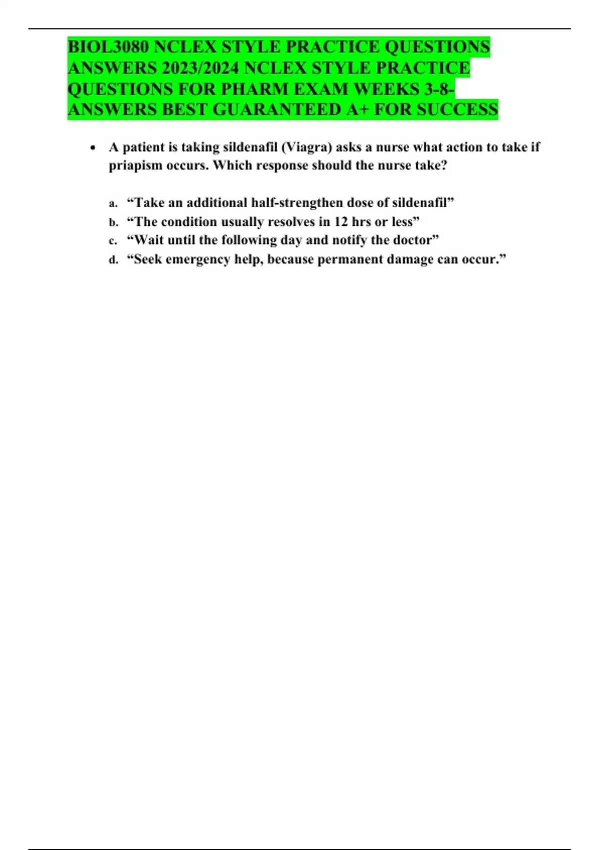 BIOL3080 NCLEX STYLE PRACTICE QUESTIONS ANSWERS 2023/2024 NCLEX STYLE PRACTICE QUESTIONS FOR PHARM EXAM WEEKS 3-8- ANSWERS BEST GUARANTEED A+ FOR SUCCESS