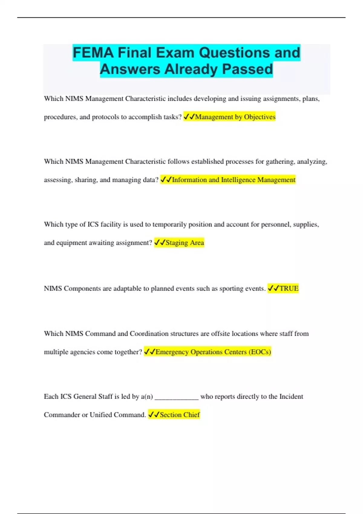 FEMA Final Exam Questions and Answers Already Passed Which NIMS Management Characteristic includes developing and issuing assignments, plans, procedures, and protocols to accomplish tasks? Management by Objectives Which NIMS Management Characteristic follows established processes for gathering, analyzing, assessing, sharing, and managing data? Information and Intelligence Management Which type of ICS facility is used to temporarily position and account for personnel, supplies, and equipment awaiting assignment? Staging Area NIMS Components are adaptable to planned events such as sporting events. TRUE Which NIMS Command and Coordination structures are offsite locations where staff from multiple agencies come together? Emergency Operations Centers (EOCs) Each ICS General Staff is led by a(n) ____________ who reports directly to the Incident Commander or Unified Command. Section Chief Establishing mutual aid agreements to obtain resources from neighboring jurisdictions is an example of which resource management activity? Planning for Resources Incident Reports, such as Situation Reports and Status Reports enhance situational awareness and ensure that personnel can access needed information. TRUE Regarding resource typing, which of the following characteristics are typically use to categorize resources? Capability The Incident Action Plan is prepared by General Staff from which section? Planning Which NIMS Management Characteristic allows units from diverse agencies to connect, share information, and achieve situational awareness? Integrated Communications Incident information is used across ICS, EOCs, MAC Groups, and JIS to aid in planning, determine incident costs, and identify safety issues. TRUE Which organizations should be involved in commmunications planning? All Stakeholders Which resource management activity identifies and verifies that personnel are qualified for a particular position? Credentialing When only certain EOC team members or organizations are activated to monitor a credible threat, which Activation Level has been implemented?