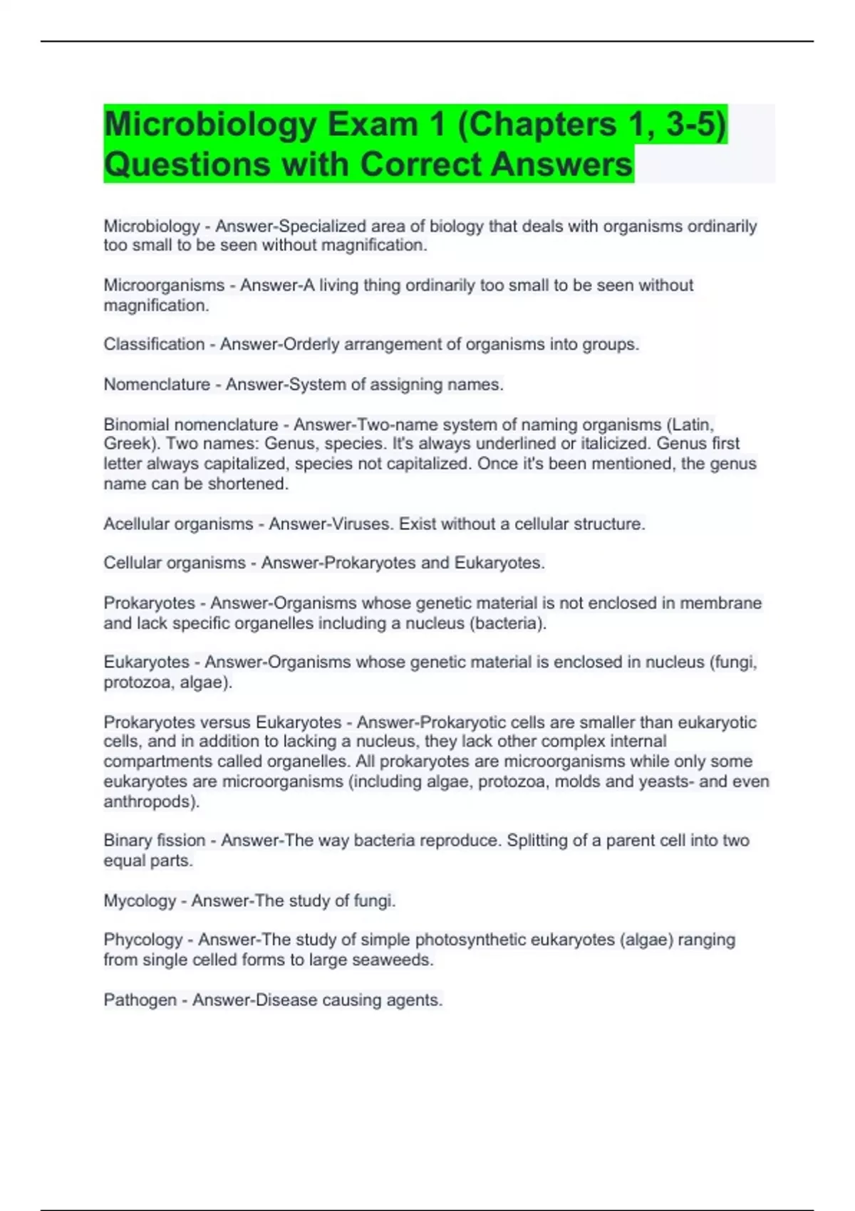 Microbiology Exam 1 Questions with Correct Answers Microorganisms - Answer-A living thing ordinarily too small to be seen without magnification. Classification - Answer-Orderly arrangement of organisms into groups. Nomenclature - Answer-System of assigning names. Binomial nomenclature - Answer-Two-name system of naming organisms (Latin, Greek). Two names: Genus, species. It's always underlined or italicized. Genus first letter always capitalized, species not capitalized. Once it's been mentioned, the genus name can be shortened. Acellular organisms - Answer-Viruses. Exist without a cellular structure. Cellular organisms - Answer-Prokaryotes and Eukaryotes. Prokaryotes - Answer-Organisms whose genetic material is not enclosed in membrane and lack specific organelles including a nucleus (bacteria). Eukaryotes - Answer-Organisms whose genetic material is enclosed in nucleus (fungi, protozoa, algae).