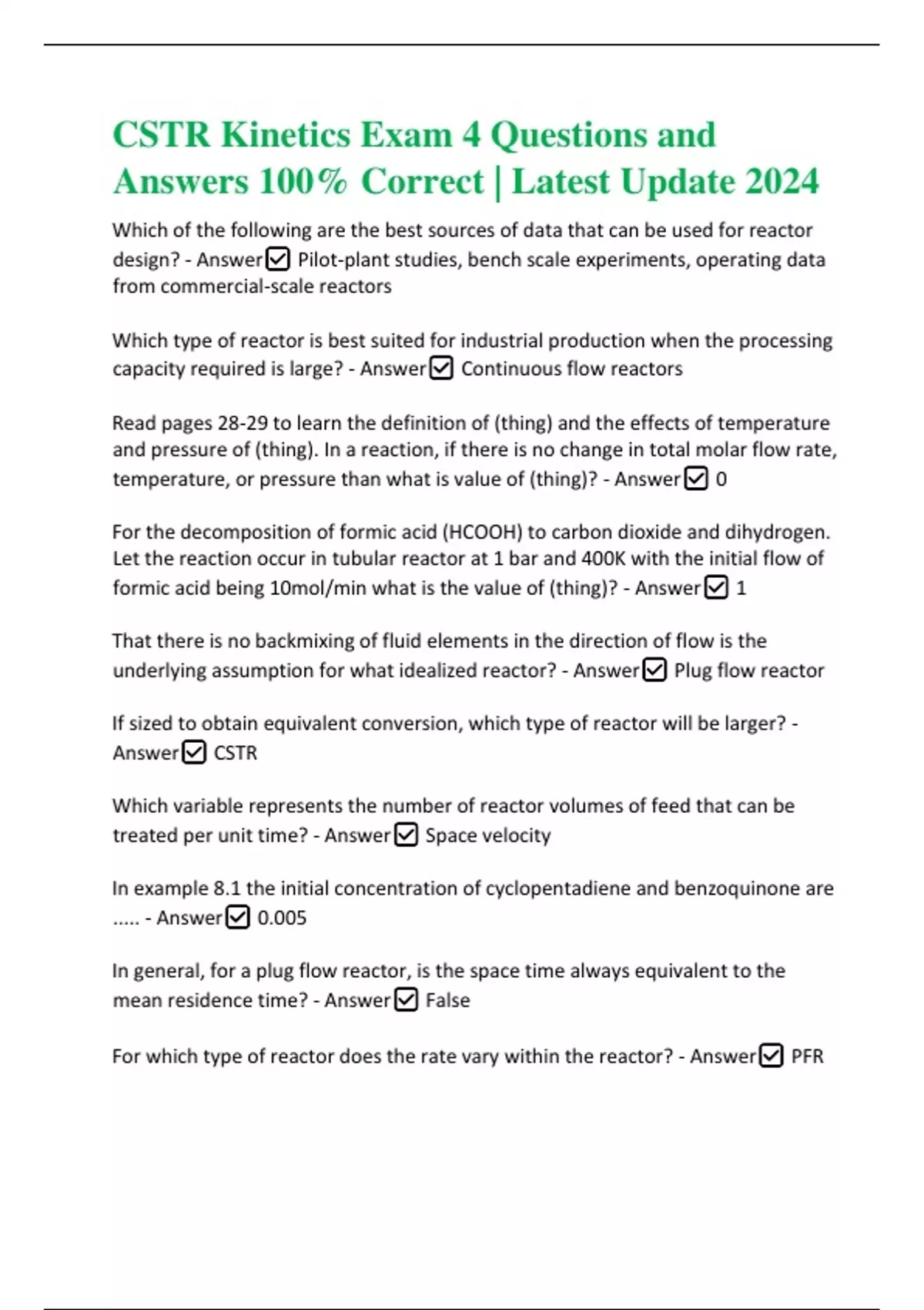 CSTR Kinetics Exam 4 Questions and Answers 100% Correct | Latest Update 2024