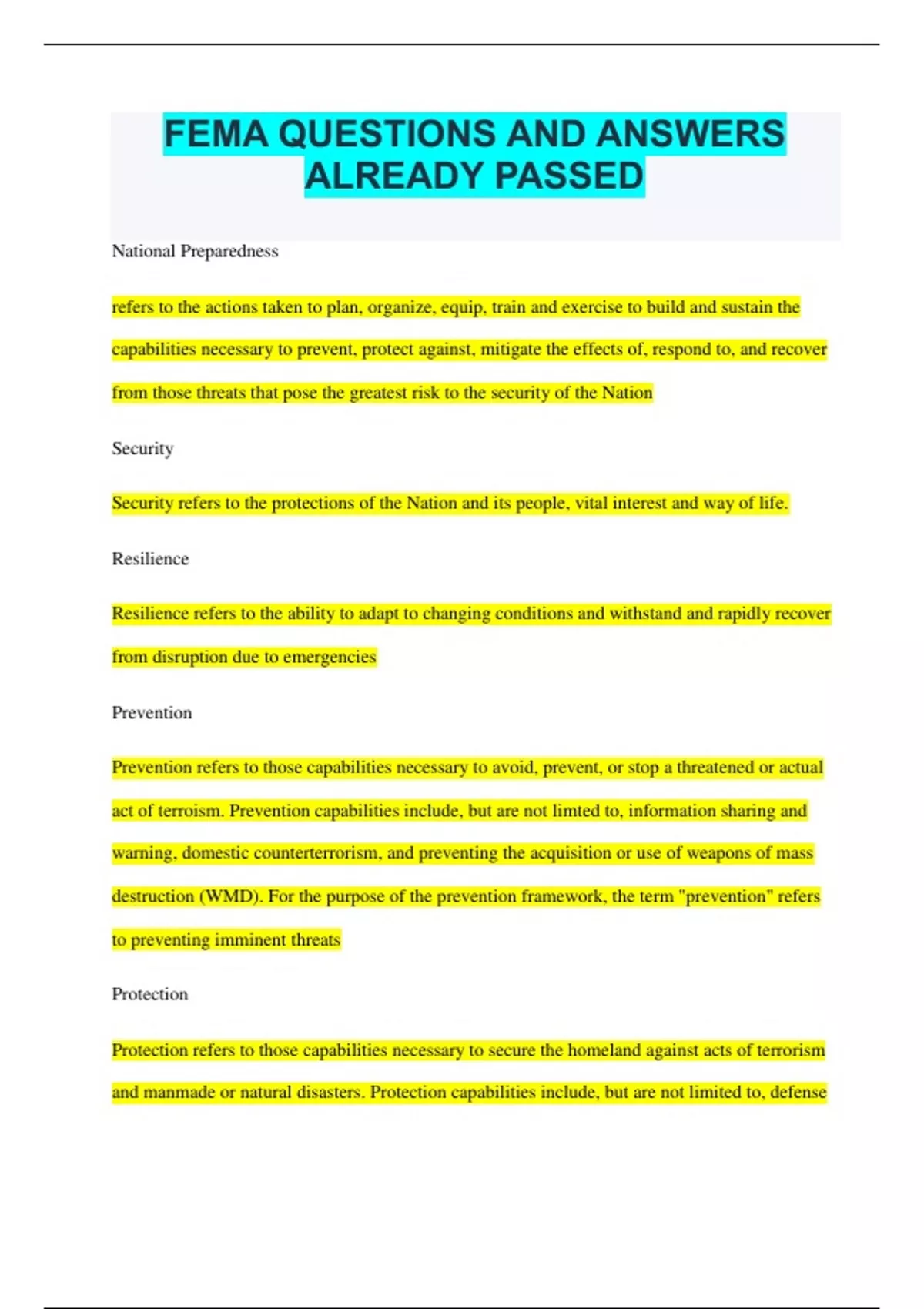FEMA QUESTIONS AND ANSWERS ALREADY PASSED National Preparedness refers to the actions taken to plan, organize, equip, train and exercise to build and sustain the capabilities necessary to prevent, protect against, mitigate the effects of, respond to, and recover from those threats that pose the greatest risk to the security of the Nation Security Security refers to the protections of the Nation and its people, vital interest and way of life. Resilience Resilience refers to the ability to adapt to changing conditions and withstand and rapidly recover from disruption due to emergencies Prevention Prevention refers to those capabilities necessary to avoid, prevent, or stop a threatened or actual act of terroism. Prevention capabilities include, but are not limted to, information sharing and warning, domestic counterterrorism, and preventing the acquisition or use of weapons of mass destruction (WMD). For the purpose of the prevention framework, the term "prevention" refers to preventing imminent threats Protection Protection refers to those capabilities necessary to secure the homeland against acts of terrorism and manmade or natural disasters. Protection capabilities include, but are not limited to, defense against WMD threats, defense of agriculture and food, critical infrastructure protection, protection of key leadership and events, border security, maritime security, transportation security, immigration security, and cyber-security. terrorism and manmade or natural disasters. Mitigation Mitigation refers to those capabilities necessary to reduce loss of life and property by lessening the impact of disasters. Mitigation capabilities include, but are not limited to, community-wide risk reduction projects, efforts to improve the resilience of critical infrastructure and key resource lifelines, risk reduction for specific vulnerabilities from natural hazards or acts of terrorism, and initiatives to reduce future risks after a disaster has occurred. reduce loss of life and property by lessening the impact of disasters. response Response refers to those capabilities necessary to save lives, protect property and the environment, and meet basic human needs after an incident has occurred. save lives, protect property and the environment, and meet basic human needs after an incident has occurred. recovery Recovery refers to those capabilities necessary to assist communities affected by an incident to recover effectively, including, but not limited to, rebuilding infrastructure systems; providing adequate interim and long-term housing for survivors; restoring health, social, and community services; promoting economic development; and restoring natural and cultural resources. recover effectively. is the ends we wish to achieve. The National Preparedness Goal is the means to achieve the goal. The National Preparedness System are the delivery and how we use what we build. The National Planning Frameworks is the progress toward achieving the goal. imminent threat is defined as intelligence or operational information that warns of a credible, specific, and impending terrorist threat or ongoing attack against the United States. The Core Capabilities are distinct critical elements necessary to meet the National Preparedness Goal.Explanation: The way we can measure, describe, and implement our security and resilience techniques is through core capabilities. True The Core Capabilities are unique to each mission area and independent of each other.Explanation: The Core Capabilities