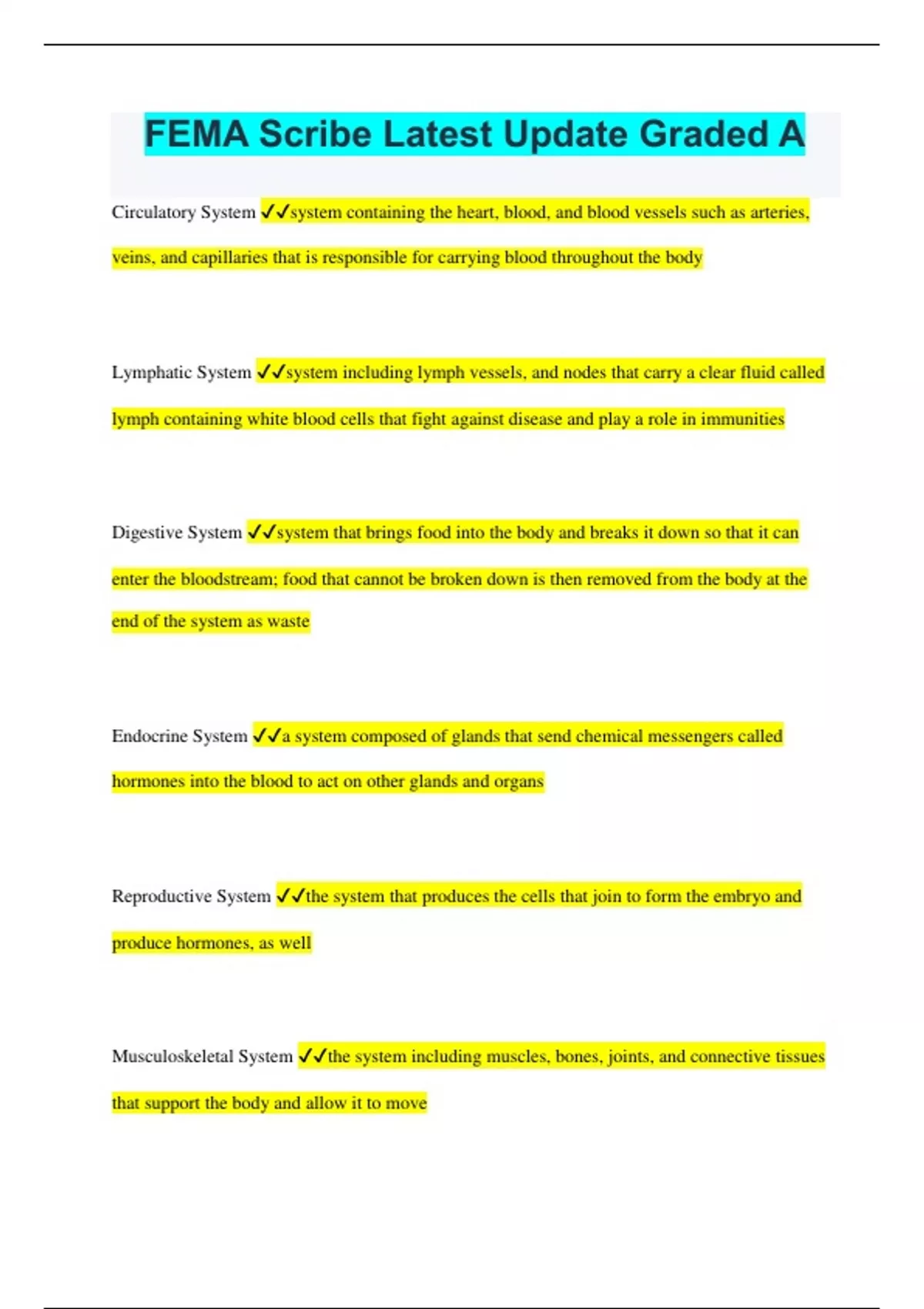 FEMA Scribe Latest Update Graded A Circulatory System system containing the heart, blood, and blood vessels such as arteries, veins, and capillaries that is responsible for carrying blood throughout the body Lymphatic System system including lymph vessels, and nodes that carry a clear fluid called lymph containing white blood cells that fight against disease and play a role in immunities Digestive System system that brings food into the body and breaks it down so that it can enter the bloodstream; food that cannot be broken down is then removed from the body at the end of the system as waste Endocrine System a system composed of glands that send chemical messengers called hormones into the blood to act on other glands and organs Reproductive System the system that produces the cells that join to form the embryo and produce hormones, as well Musculoskeletal System the system including muscles, bones, joints, and connective tissues that support the body and allow it to move Nervous System system that carries electrical messages to and from the brain and spinal cord Respiratory System controls breathing, a process in which air enters and leaves the body Skin and Sense System including the skin, eyes, and ears; receives messages from the environment and sends them to the brain Urinary System produces urine and sends it out of the body through kidneys, ureters, and bladder, and urethra. Abdomin/o pertaining to the abdomen Anter/o pertaining to the front Bronch/p pertaining to the bronchial tubes Cervic/o pertaining to the neck Chondr/o pertaining to the cartilage Coccyg/o pertaining to the cocyx or tailbone Crani/o pertaining to the skull Epitheli/o pertaining to the skin or surface tissue Esophag/o pertaining to the esophagus Laryng/o pertaining to the larynx Later/o pertaining to the side Lumb/o pertaining to the waist