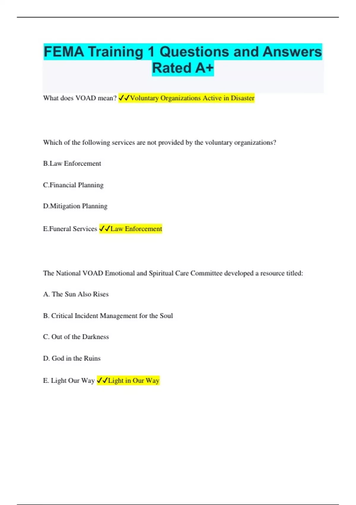 FEMA Training 1 Questions and Answers Rated A+ What does VOAD mean? Voluntary Organizations Active in Disaster Which of the following services are not provided by the voluntary organizations? B.Law Enforcement C.Financial Planning D.Mitigation Planning E.Funeral Services Law Enforcement The National VOAD Emotional and Spiritual Care Committee developed a resource titled: A. The Sun Also Rises B. Critical Incident Management for the Soul C. Out of the Darkness D. God in the Ruins E. Light Our Way Light in Our Way TRUE/FALSE: Emergency managers have authority to direct voluntary organizational assets True During non-operational periods, VALS continue to build/maintain relationships and enhance collaboration. A. Build relationships B. Maintain relationships C. Enhance collaboration D. Foster a strong rapport between voluntary organizations, Federal agencies, and emergency managers E. All of the above All of the above TRUE/FALSE: Voluntary organizations end their disaster programs at the same time government disaster assistance concludes False TRUE/FALSE: Services delivered by voluntary organizations have not changed over time False TRUE/FALSE: Construction estimating is a program offered by certain voluntary organizations True Collaboration in action does not include: A. VOAD B. DCTs C. LTRGs D. CAN E. XYZs VOAD TRUE/FALSE: Donations arrive before a Federal disaster declaration True Partners in collaboration include: A. Private Sector B. Faith-Based Organizations C. Community-Based Organizations D. All of the above