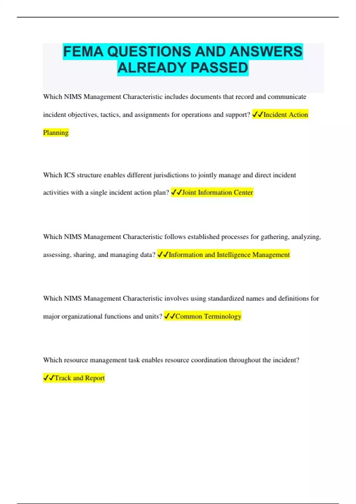 FEMA QUESTIONS AND ANSWERS ALREADY PASSED Which NIMS Management Characteristic includes documents that record and communicate incident objectives, tactics, and assignments for operations and support? Incident Action Planning Which ICS structure enables different jurisdictions to jointly manage and direct incident activities with a single incident action plan? Joint Information Center Which NIMS Management Characteristic follows established processes for gathering, analyzing, assessing, sharing, and managing data? Information and Intelligence Management Which NIMS Management Characteristic involves using standardized names and definitions for major organizational functions and units? Common Terminology Which resource management task enables resource coordination throughout the incident? Track and Report Incident information is used across ICS, EOCs, MAC Groups, and JIS to aid in planning, detmine incident costs, and identify safety issues. TRUE Each ICS General Staff is led by a(n) ________ who reports directly to the Incident Commander or Unified Command. Section Chief Emergency Management Assistance Compact(EMAC) is a state-to-state system for sharing resources during an emergency or disaster. TRUE Use of communications and information systems tat are familiar to users is a part of which key principle? Reliability, Scalability, and Portability The three NIMS guiding principles are: Flexibility, standardization, unity of effort Using social media to support activities such as producing maps and incident visualizations is an example of which communications standard? None of the Above Which resource management task deploys or activates personnel and resources? Mobilize Which of the following is an EOC function? Coordinating plans and determining resource needs Collecting, analyzing, and sharing information. Providing coordination and policy direction. Which NIMS Management Characteristic refers to the number of subordinates that directly report to a supervisor? Manageable Span of Control Ensuring the uninterrupted flow of information describes which key communications and information systems principle? Resilience and Redundancy Which organizations should be involved in communications planning? All Stakeholders Which NIMS Command and Coordination structures are offsite locations where staff from multiple agencies come together? Emergency