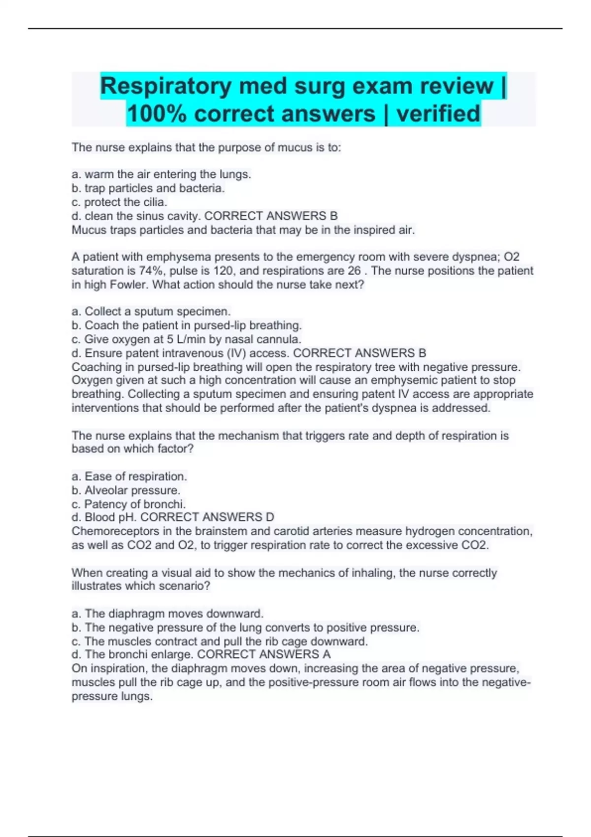 Respiratory med surg exam review | 100% correct answers | verified