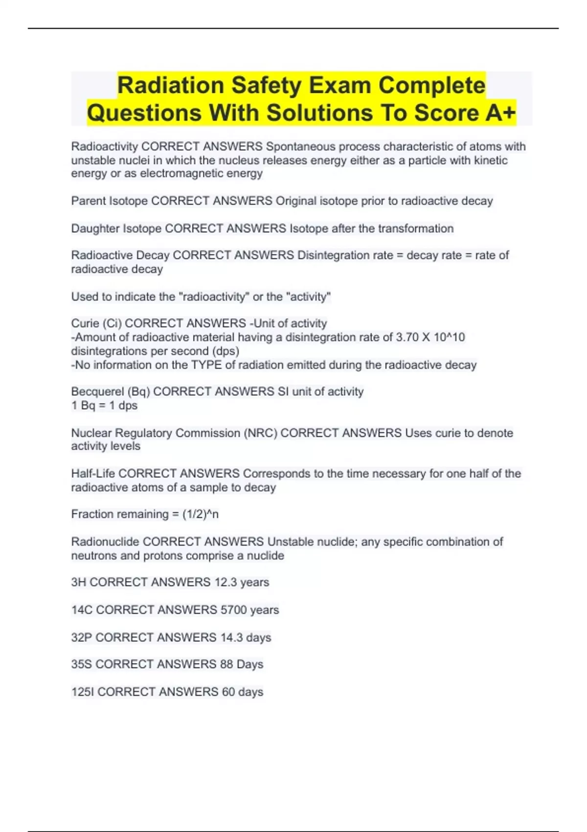 Radiation Safety Exam Complete Questions With Solutions To Score A+