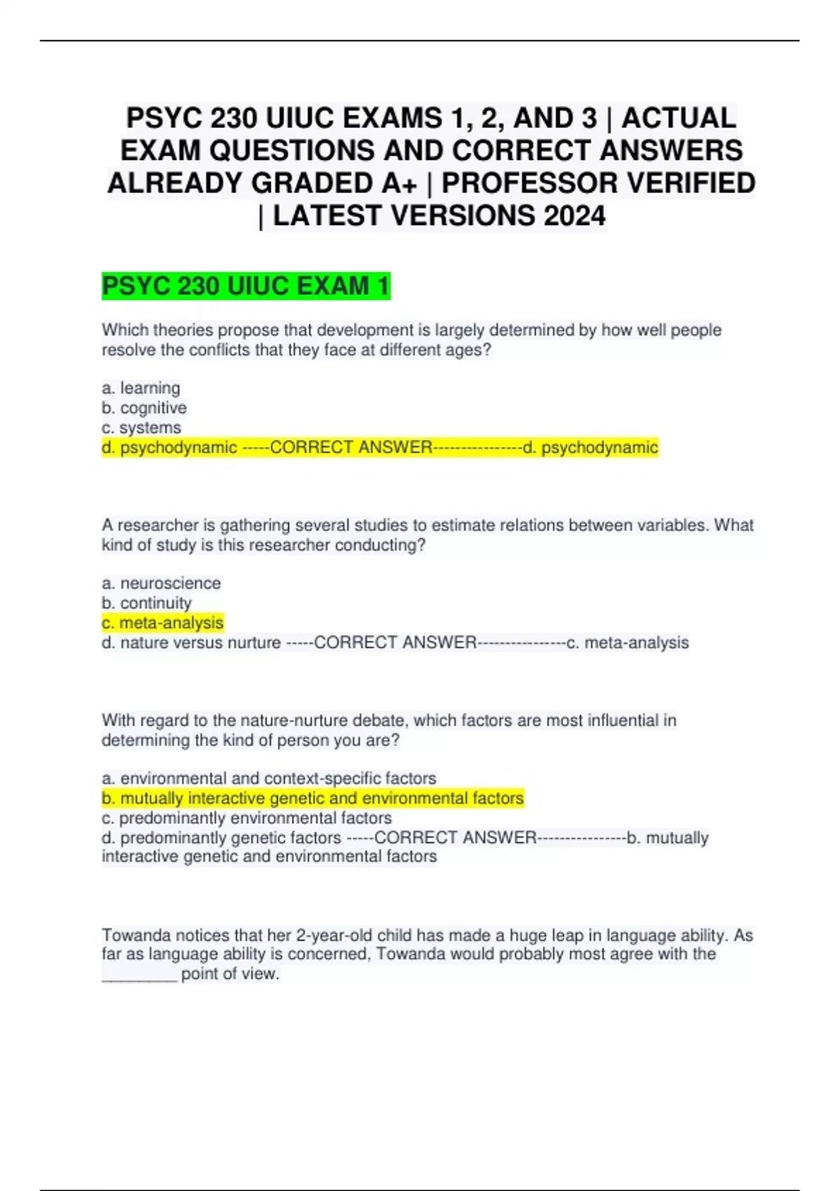 PSYC 230 UIUC EXAMS 1, 2, AND 3 | ACTUAL EXAM QUESTIONS AND CORRECT ANSWERS ALREADY GRADED A+ | PROFESSOR VERIFIED | LATEST VERSIONS 2024
