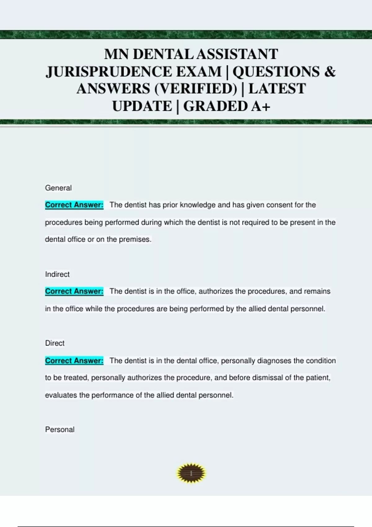 MN DENTAL ASSISTANT JURISPRUDENCE EXAM | QUESTIONS & ANSWERS (VERIFIED) | LATEST UPDATE | GRADED A+