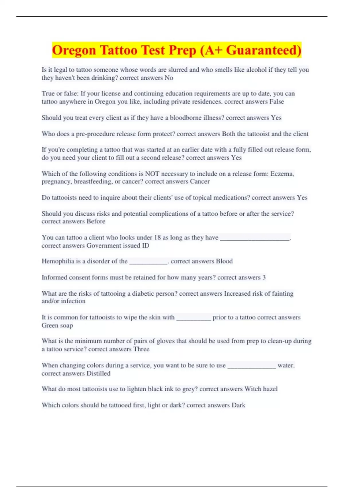 Oregon Tattoo Test Prep (A+ Guaranteed)