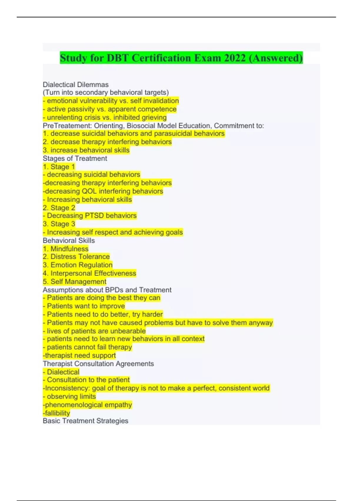 Study for DBT Certification Exam 2022 (Answered) Dialectical Dilemmas (Turn into secondary behavioral targets) - emotional vulnerability vs. self invalidation - active passivity vs. apparent competence - unrelenting crisis vs. inhibited grieving PreTreatement: Orienting, Biosocial Model Education, Commitment to: 1. decrease suicidal behaviors and parasuicidal behaviors 2. decrease therapy interfering behaviors 3. increase behavioral skills Stages of Treatment 1. Stage 1 - decreasing suicidal behaviors -decreasing therapy interfering behaviors -decreasing QOL interfering behaviors - Increasing behavioral skills 2. Stage 2 - Decreasing PTSD behaviors 3. Stage 3 - Increasing self respect and achieving goals Behavioral Skills 1. Mindfulness 2. Distress Tolerance 3. Emotion Regulation 4. Interpersonal Effectiveness 5. Self Management Assumptions about BPDs and Treatment - Patients are doing the best they can - Patients want to improve - Patients need to do better, try harder - Patients may not have caused problems but have to solve them anyway - lives of patients are unbearable - patients need to learn new behaviors in all context - patients cannot fail therapy -therapist need support Therapist Consultation Agreements - Dialectical - Consultation to the patient -Inconsistency: goal of therapy is not to make a perfect, consistent world - observing limits -phenomenological empathy -fallibility Basic Treatment Strategies - Dialectical strategies - Core Strategies: Validation and Problem solving - Stylistic Strategies: Reciprocal Communication and Irreverence - Case Management Strategies: Environmental Intervention and Consultation to the Patient Dialectical Strategies Acceptance vs Change centeredness vs flexibility nurturing vs demanding Specific Dialectical interventions - making lemonade out of lemons -extending -wise mind -dialectical assessment -natural change -devils advocate -metaphor -entering the paradox Core DBT strategies 1. Validation -emotional validation -behavioral validation -cognitive validation -cheerleading 2. Problem Solving -Problems in patients life, DBT is solution -Applying four change strategies -Solving problems in everyday life as they come up Emotional Validation Strategies 1. Opportunity to express 2. Observe and label 3. Read emotions 4. Communicate validity Behavioral Validation Strategies 1. Observe and label 2. Identify the should 3. Counter the should 4. Accept the should 5. Validate disappointment Cognitive Validation Strategies 1. Elicit and reflect thoughts 2. Discriminate facts from interpretations 3. Find Kernel of truth 4. Acknowledge wise mind 5. Respect differing values Cheerleading Strategies