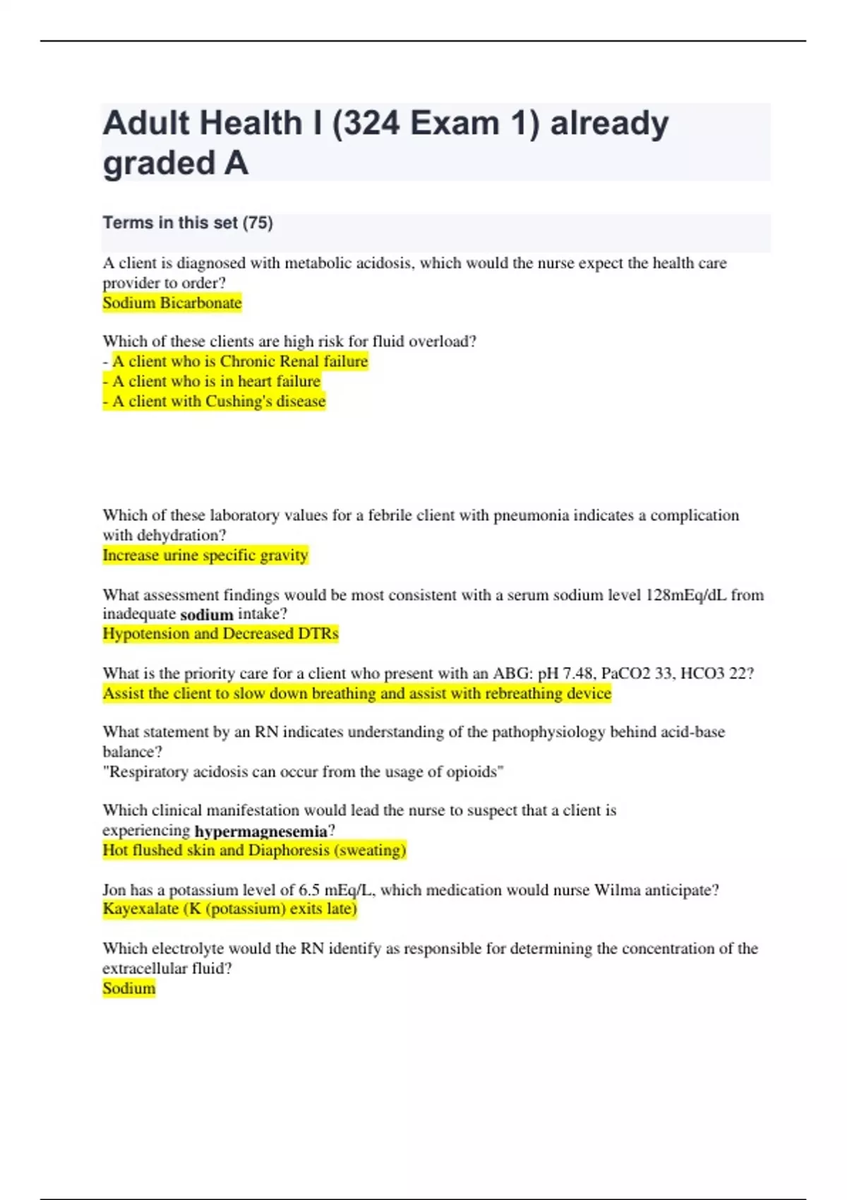 Adult Health I (324 Exam 1) already graded A Terms in this set (75) A client is diagnosed with metabolic acidosis, which would the nurse expect the health care provider to order? Sodium Bicarbonate Which of these clients are high risk for fluid overload? - A client who is Chronic Renal failure - A client who is in heart failure - A client with Cushing's disease Brainpower Read More 0:01 / 0:15 Which of these laboratory values for a febrile client with pneumonia indicates a complication with dehydration? Increase urine specific gravity What assessment findings would be most consistent with a serum sodium level 128mEq/dL from inadequate sodium intake? Hypotension and Decreased DTRs What is the priority care for a client who present with an ABG: pH 7.48, PaCO2 33, HCO3 22? Assist the client to slow down breathing and assist with rebreathing device What statement by an RN indicates understanding of the pathophysiology behind acid-base balance? "Respiratory acidosis can occur from the usage of opioids" Which clinical manifestation would lead the nurse to suspect that a client is experiencing hypermagnesemia? Hot flushed skin and Diaphoresis (sweating) Jon has a potassium level of 6.5 mEq/L, which medication would nurse Wilma anticipate? Kayexalate (K (potassium) exits late) Which electrolyte would the RN identify as responsible for determining the concentration of the extracellular fluid? Sodium Lab tests revealed that patient Z's [Na+] is 170 mEq/L. Which clinical manifestation would nurse Natty expect to assess? Tented skin turgor and thirst Tetany is most likely to result from which of the following electrolyte disorders? Hypocalcemia What is Tetany? A condition marked by intermittent muscular spasms, caused by malfunction of the parathyroid glands and a consequent deficiency of calcium. Which of the following IV solutions would be appropriate for a patient with severe hyponatremia secondary to SIADH? Hypertonic solution What disorder impairs water excretion caused by the inability to suppress the secretion of antidiuretic hormone (ADH) syndrome of inappropriate secretion of antidiuretic hormone (SIADH) When assessing a patient for signs of fluid overload, the nurse would expect to observe: Bounding pulse Normal venous blood pH ranges from: 7.35-7.45 Mr. Wenceslao is scheduled to receive an isotonic solution; which one of the following is an example of such a solution? 0.9% Saline You are proving care to a client with metabolic alkalosis. Which ABG results are consistent with this imbalance? pH 7.50, PaCO2 29, HCO3 30 A patient with which of the following disorders is at high risk for developing hyperphosphatemia? Hypocalcemia A client has the following ABG: pH 7.32, CO2 49, HCO3 29, PO2 80. Based on these results, the client is experiencing? Respiratory acidosis You are caring for a client with metabolic acidosis. You would assess for which sign and symptoms of this imbalance? Lethargy - Hyporeflexia