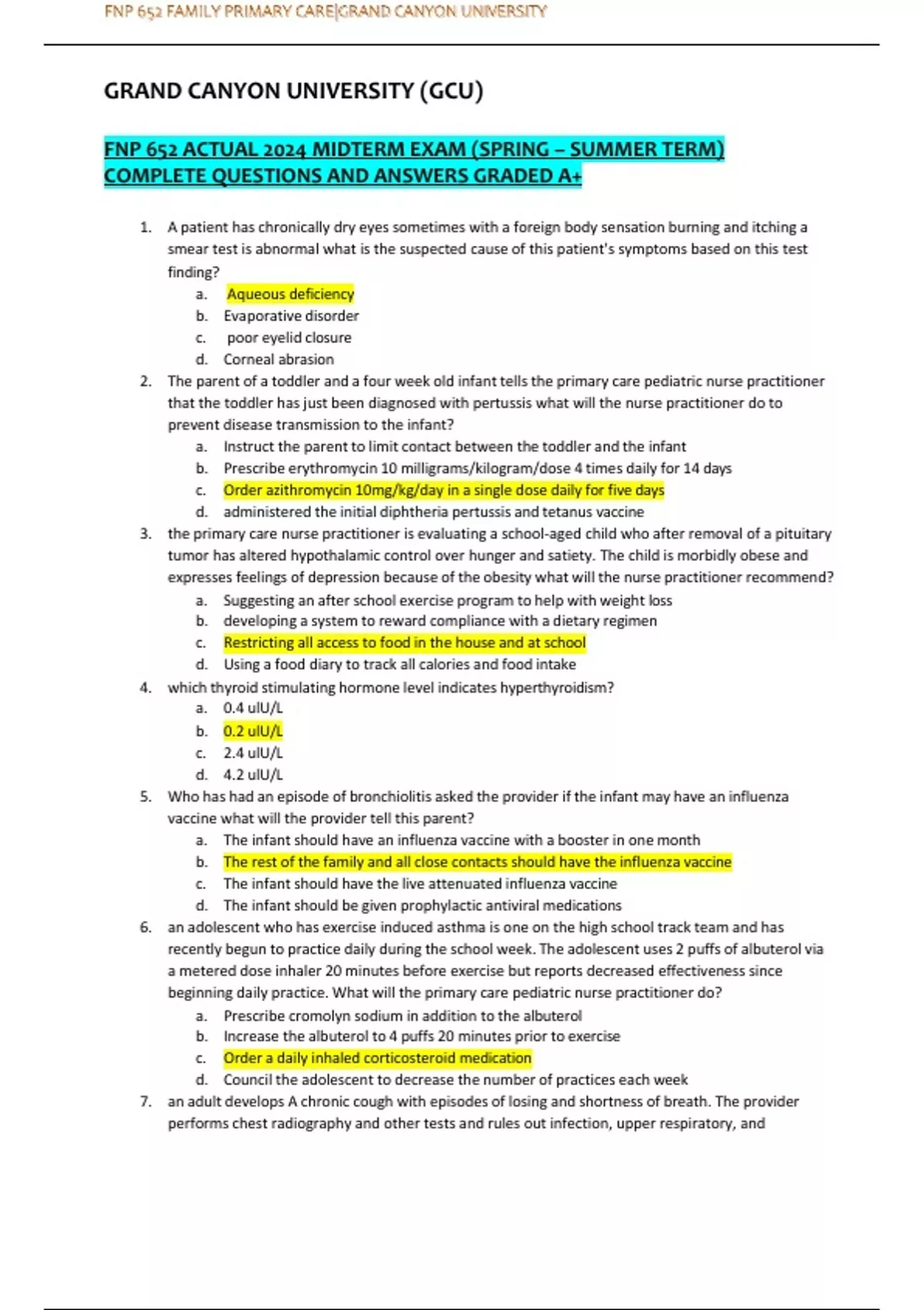 GRAND CANYON UNIVERSITY (GCU) FNP 652 ACTUAL 2024 MIDTERM EXAM (SPRING – SUMMER TERM) COMPLETE QUESTIONS AND ANSWERS GRADED A+ 1. A patient has chronically dry eyes sometimes with a foreign body sensation burning and itching a smear test is abnormal what is the suspected cause of this patient's symptoms based on this test finding? a. Aqueous deficiency b. Evaporative disorder c. poor eyelid closure d. Corneal abrasion 2. The parent of a toddler and a four week old infant tells the primary care pediatric nurse practitioner that the toddler has just been diagnosed with pertussis what will the nurse practitioner do to prevent disease transmission to the infant? a. Instruct the parent to limit contact between the toddler and the infant b. Prescribe erythromycin 10 milligrams/kilogram/dose 4 times daily for 14 days c. Order azithromycin 10mg/kg/day in a single dose daily for five days d. administered the initial diphtheria pertussis and tetanus vaccine 3. the primary care nurse practitioner is evaluating a school-aged child who after removal of a pituitary tumor has altered hypothalamic control over hunger and satiety. The child is morbidly obese and expresses feelings of depression because of the obesity what will the nurse practitioner recommend? a. Suggesting an after school exercise program to help with weight loss b. developing a system to reward compliance with a dietary regimen c. Restricting all access to food in the house and at school d. Using a food diary to track all calories and food intake 4. which thyroid stimulating hormone level indicates hyperthyroidism? a. 0.4 ulU/L b. 0.2 ulU/L c. 2.4 ulU/L d. 4.2 ulU/L 5. Who has had an episode of bronchiolitis asked the provider if the infant may have an influenza vaccine what will the provider tell this parent? a. The infant should have an influenza vaccine with a booster in one month b. The rest of the family and all close contacts should have the influenza vaccine c. The infant should have the live attenuated influenza vaccine d. The infant should be given prophylactic antiviral medications 6. an adolescent who has exercise induced asthma is one on the high school track team and has recently begun to practice daily during the school week. The adolescent uses 2 puffs of albuterol via a metered dose inhaler 20 minutes before exercise but reports decreased effectiveness since beginning daily practice. What will the primary care pediatric nurse practitioner do? a. Prescribe cromolyn sodium in addition to the albuterol b. Increase the albuterol to 4 puffs 20 minutes prior to exercise c. Order a daily inhaled corticosteroid medication d. Council the adolescent to decrease the number of practices each week 7. an adult develops A chronic cough with episodes of losing and shortness of breath. The provider performs chest radiography and other tests and rules out infection, upper respiratory, and gastroesophageal causes. Which test will the provider order initially to evaluate the possibility of asthma as the cause of these symptoms? a. Methacholine challenge test b. Spirometry c. Peak expiratory flow rate d. Allergy testing 8. after 14 days of treatment with amoxicillin 45 mg/kg/day for acute rhinosinusitis , a child continues to have mucopurulent nasal discharge along with induration, swelling, and erythema of both eyelids. What is the next course of treatment? a. Amoxicillin 80 mg/kg/day for 14 days b. Antibiotic ophthalmic drops for five to seven days c. Referral to a pediatric otolaryngologist d. amoxicillin clavulanate for 10 to 14 days 9. a previously healthy school aged child develops a cough and a low grade fever. The primary care pediatric nurse practitioner auscultates wheezes and all lung fiel