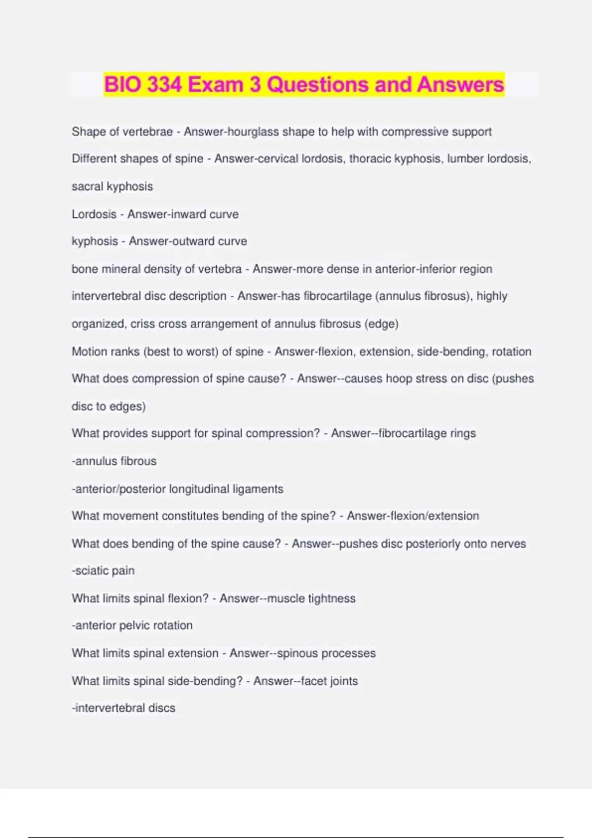 BIO 334 Exam 3 Questions and Answers Shape of vertebrae - Answer-hourglass shape to help with compressive support Different shapes of spine - Answer-cervical lordosis, thoracic kyphosis, lumber lordosis, sacral kyphosis Lordosis - Answer-inward curve kyphosis - Answer-outward curve bone mineral density of vertebra - Answer-more dense in anterior-inferior region intervertebral disc description - Answer-has fibrocartilage (annulus fibrosus), highly organized, criss cross arrangement of annulus fibrosus (edge) Motion ranks (best to worst) of spine - Answer-flexion, extension, side-bending, rotation What does compression of spine cause? - Answer--causes hoop stress on disc (pushes disc to edges) What provides support for spinal compression? - Answer--fibrocartilage rings -annulus fibrous -anterior/posterior longitudinal ligaments What movement constitutes bending of the spine? - Answer-flexion/extension What does bending of the spine cause? - Answer--pushes disc posteriorly onto nerves -sciatic pain What limits spinal flexion? - Answer--muscle tightness -anterior pelvic rotation What limits spinal extension - Answer--spinous processes What limits spinal side-bending? - Answer--facet joints -intervertebral discs What limits spinal rotation? - Answer--facet joints -intervertebral discs What helps support spinal rotation? - Answer-criss-cross arrangement of collagen fibers of annulus fibrosus decrease the load on individual discs What force is our body built to best sustain? - Answer-compression forces (12000N) Typical activities that cause compression forces - Answer--carrying backpacks -running/walking -sports (gymnastics) -weight lifting -falls -certain occupations Consequences of compression forces - Answer--intervertebral buldges/ruptures can lead to radiating pain, numbness, weakness, asymmetry, and change in cobb angle What is the typical amount of shear forces that the body withstands in the spine throughout the day? - Answer-1000N Shear forces of the spine activities - Answer--rowing -improper lifting -car crash (whiplash) -falls (feet slip out and you fall down) Are most actions shear or compression forces? - Answer-a combination What was the purpose of the Neushwander study? - Answer-to measure the lumbar spine response to typical school backpack loads in healthy children