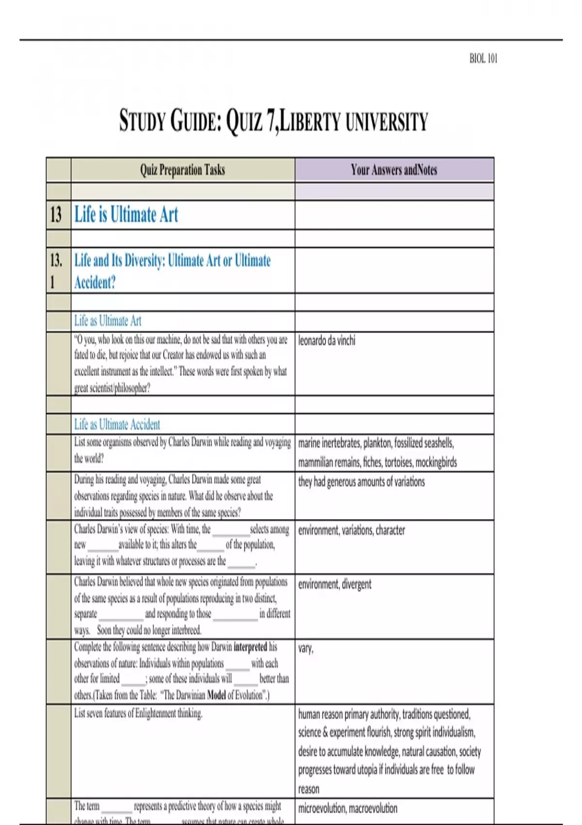 BIOL 101 Study Guide Quiz 7, BIOL 101 PRINCIPLES OF BIOLOGY, Liberty University.