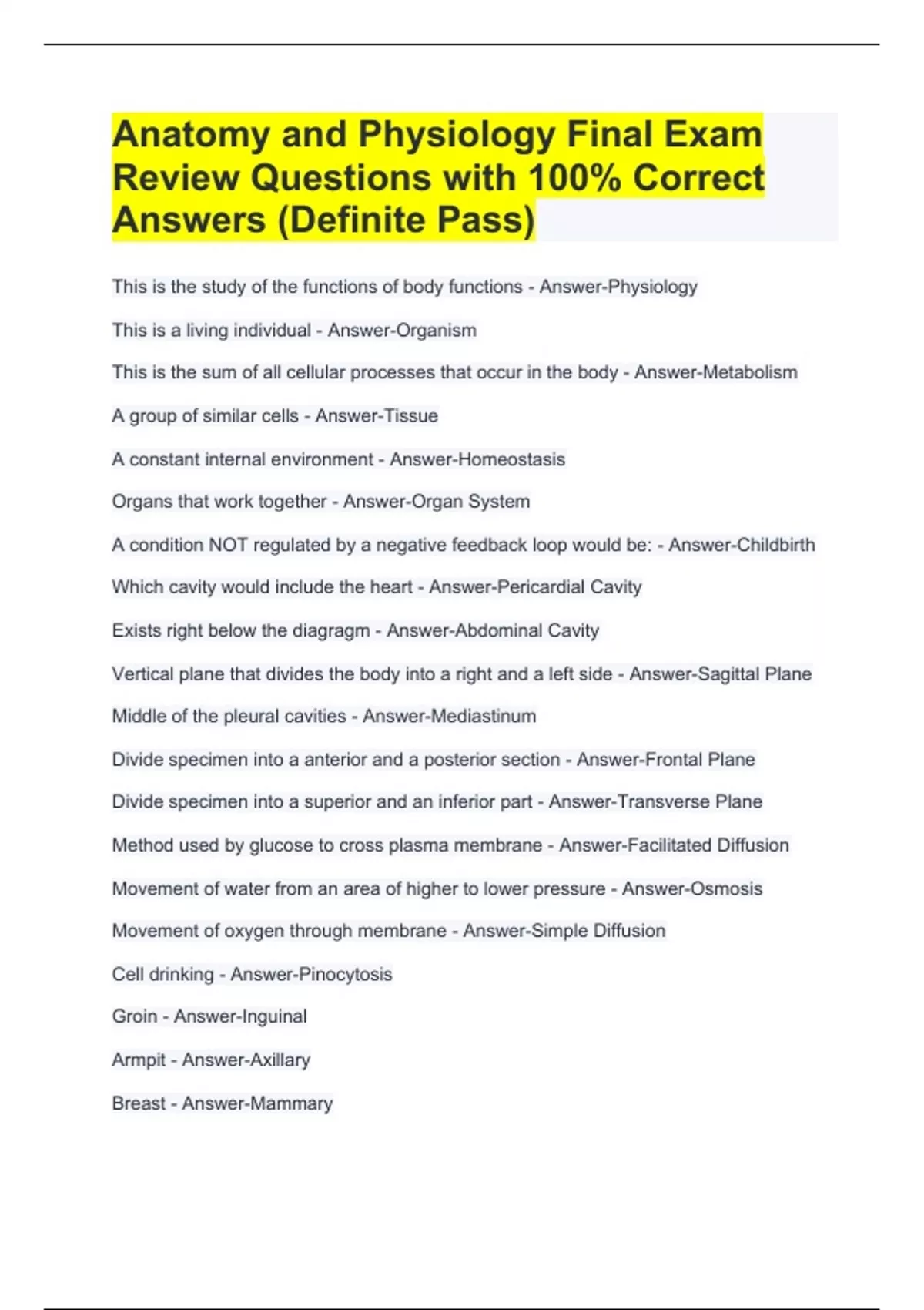 Anatomy and Physiology Final Exam Review Questions with 100% Correct Answers (Definite Pass) Organs that work together - Answer-Organ System A condition NOT regulated by a negative feedback loop would be: - Answer-Childbirth Which cavity would include the heart - Answer-Pericardial Cavity Exists right below the diagragm - Answer-Abdominal Cavity Vertical plane that divides the body into a right and a left side - Answer-Sagittal Plane Middle of the pleural cavities - Answer-Mediastinum Divide specimen into a anterior and a posterior section - Answer-Frontal Plane Divide specimen into a superior and an inferior part - Answer-Transverse Plane Method used by glucose to cross plasma membrane - Answer-Facilitated Diffusion Movement of water from an area of higher to lower pressure - Answer-Osmosis