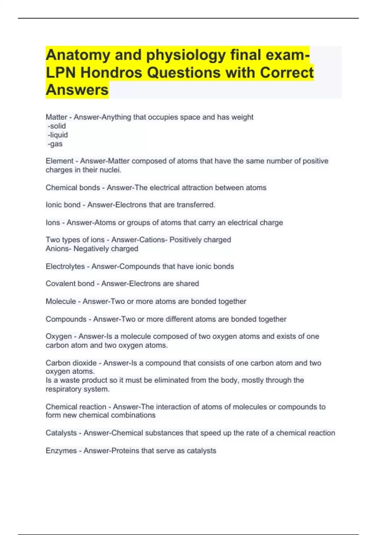 Anatomy and physiology final exam- LPN Hondros Questions with Correct Answers