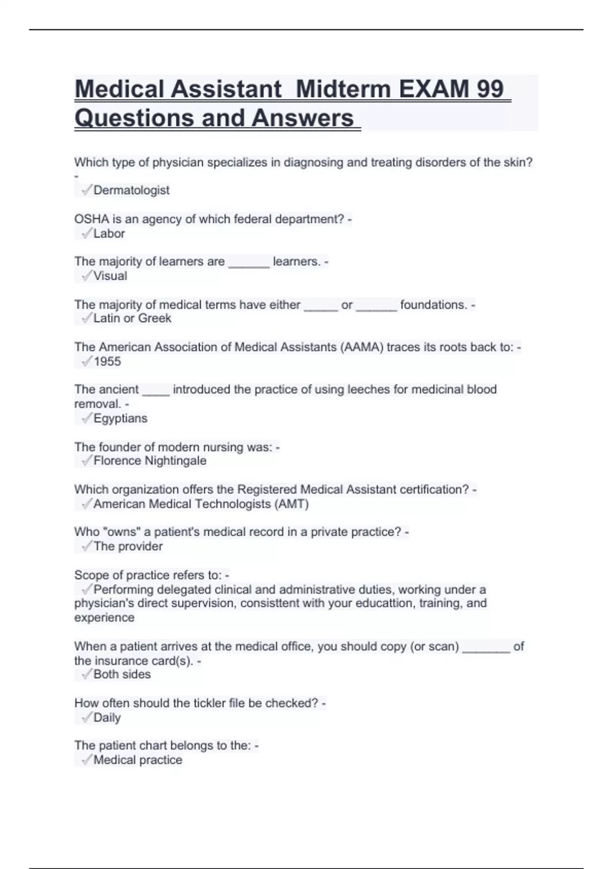 Medical Assistant Midterm EXAM 99 Questions and Answers.