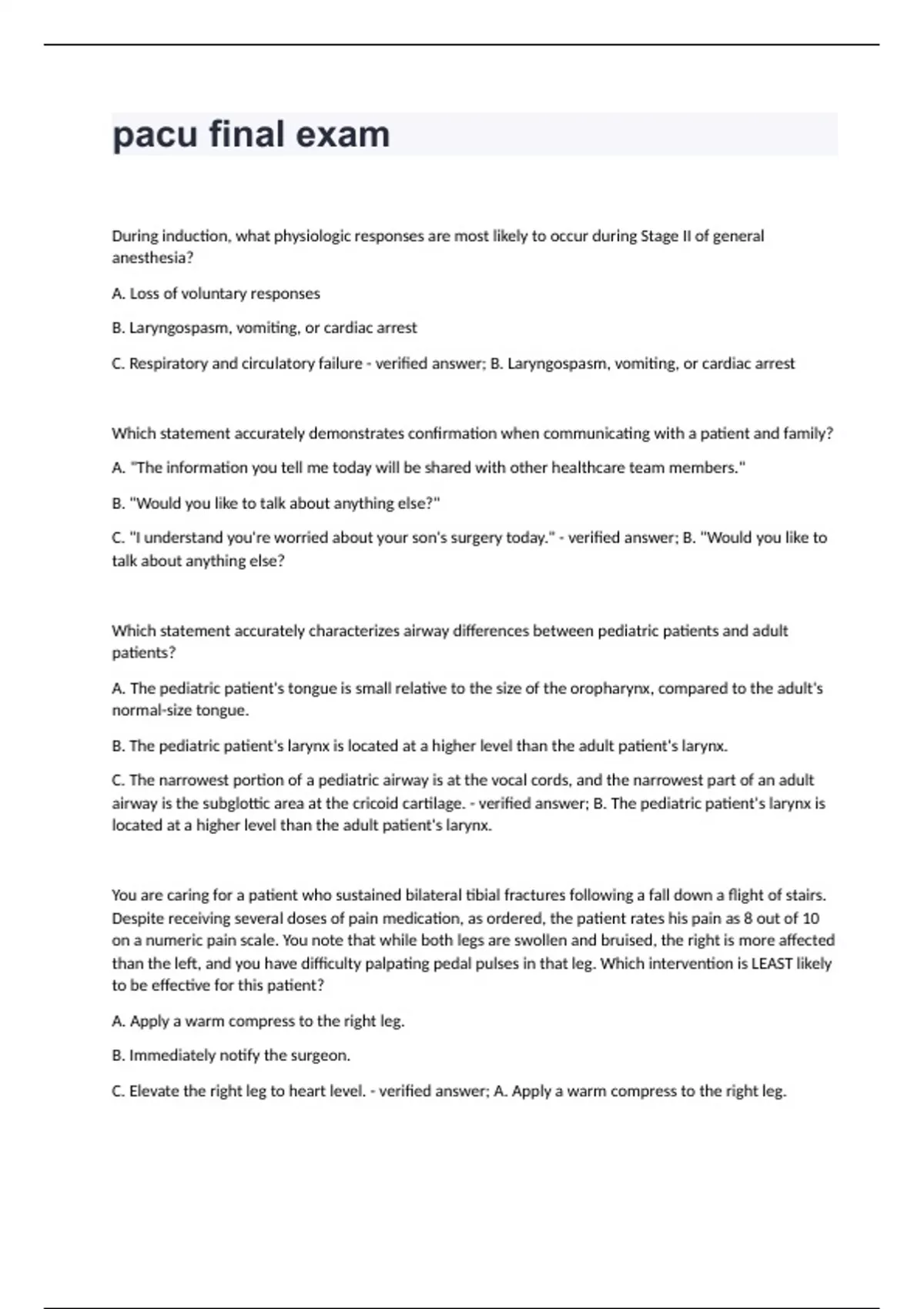 pacu final exam with correct answers
