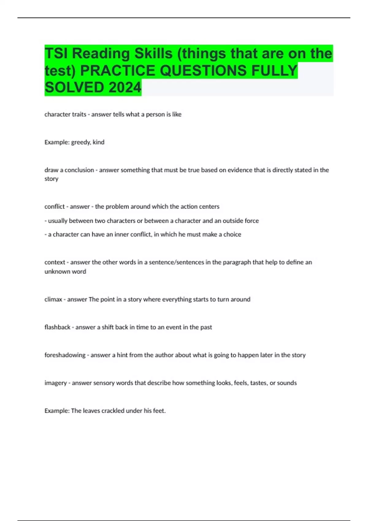 TSI Reading Skills (things that are on the test) PRACTICE QUESTIONS FULLY SOLVED 2024