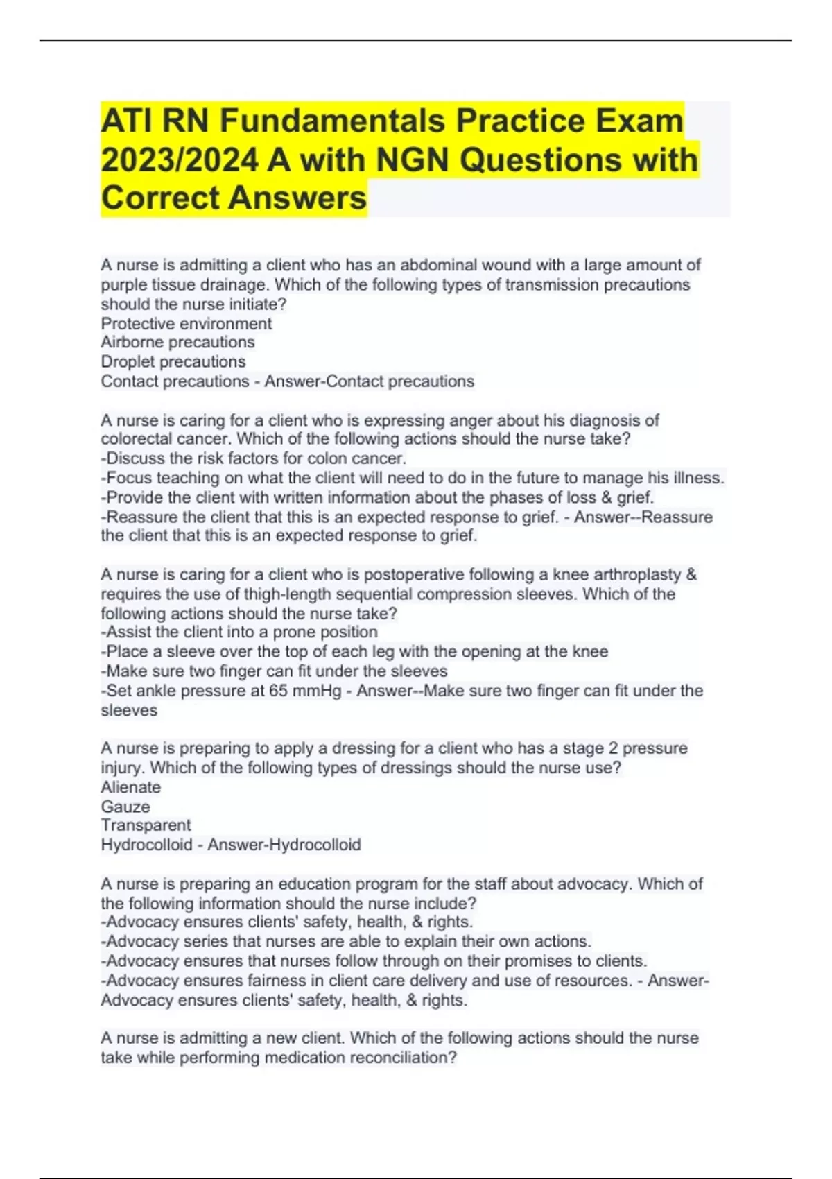ATI RN Fundamentals Practice Exam 2023/2024 A with NGN Questions with Correct Answers A nurse is caring for a client who is postoperative following a knee arthroplasty & requires the use of thigh-length sequential compression sleeves. Which of the following actions should the nurse take? -Assist the client into a prone position -Place a sleeve over the top of each leg with the opening at the knee -Make sure two finger can fit under the sleeves -Set ankle pressure at 65 mmHg - Answer--Make sure two finger can fit under the sleeves A nurse is preparing to apply a dressing for a client who has a stage 2 pressure injury. Which of the following types of dressings should the nurse use? Alienate Gauze Transparent Hydrocolloid - Answer-Hydrocolloid A nurse is preparing an education program for the staff about advocacy. Which of the following information should the nurse include? -Advocacy ensures clients' safety, health, & rights. -Advocacy series that nurses are able to explain their own actions. -Advocacy ensures that nurses follow through on their promises to clients. -Advocacy ensures fairness in client care delivery and use of resources. - Answer-Advocacy ensures clients' safety, health, & rights. A nurse is admitting a new client. Which of the following actions should the nurse take while performing medication reconciliation?