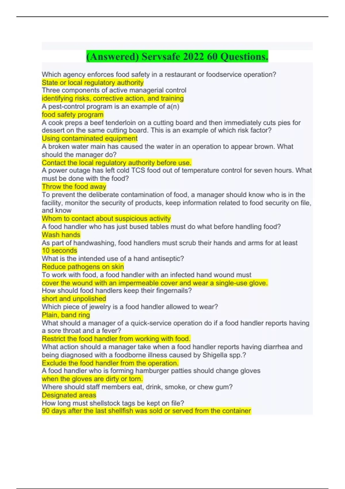 (Answered) Servsafe 2022 60 Questions. Which agency enforces food safety in a restaurant or foodservice operation? State or local regulatory authority Three components of active managerial control identifying risks, corrective action, and training A pest-control program is an example of a(n) food safety program A cook preps a beef tenderloin on a cutting board and then immediately cuts pies for dessert on the same cutting board. This is an example of which risk factor? Using contaminated equipment A broken water main has caused the water in an operation to appear brown. What should the manager do? Contact the local regulatory authority before use. A power outage has left cold TCS food out of temperature control for seven hours. What must be done with the food? Throw the food away To prevent the deliberate contamination of food, a manager should know who is in the facility, monitor the security of products, keep information related to food security on file, and know Whom to contact about suspicious activity A food handler who has just bused tables must do what before handling food? Wash hands As part of handwashing, food handlers must scrub their hands and arms for at least 10 seconds What is the intended use of a hand antiseptic? Reduce pathogens on skin To work with food, a food handler with an infected hand wound must cover the wound with an impermeable cover and wear a single-use glove. How should food handlers keep their fingernails? short and unpolished Which piece of jewelry is a food handler allowed to wear? Plain, band ring What should a manager of a quick-service operation do if a food handler reports having a sore throat and a fever? Restrict the food handler from working with food. What action should a manager take when a food handler reports having diarrhea and being diagnosed with a foodborne illness caused by Shigella spp.? Exclude the food handler from the operation. A food handler who is forming hamburger patties should change gloves when the gloves are dirty or torn. Where should staff members eat, drink, smoke, or chew gum? Designated areas How long must shellstock tags be kept on file? 90 days after the last shellfish was sold or served from the container When receiving a delivery of food for an operation, it is important to inspect all food immediately before storing it. What are the packaging criteria for accepting nonfood items? Intact, clean, and protected from contamination Which item is stored correctly in the cooler? Maccoroni salad stored above raw salmon Ready-to-eat TCS food must be date-marked if it will be stored for longer than 24 hours How should flatware that has been cleaned and sanitized be stored? With the handles facing up A recall has been issued for a specific brand of orange juice. The store manager has matched the information from the recall notice to the item, removed the item from inventory, and stored it in a secure location. What should the manager do next? Label the item to prevent it from accidentally being placed back in inventory What is the maximum amount of time that ready-to-eat TCS food can be stored in a cooler at 41°F (5°C) before it must be sold, served, or thrown out? 7 days A food handler is prepping a seafood coconut curry dish on April 4 using shrimp and scallops. The shrimp has a use-by date of April 8 and the scallops' use-by date is April 10. What is the use-by date for the seafood coconut curry? April 8th What type of container should be used to transport TCS food from the place of preparation to the place of service? Insulated Pathogens are likely to grow well in a meat stew that is between 41°F and 135°F (5°C and 57°C). Which is a TCS food? Sprouts Cut melons should be stored at what internal temperature? 41°F (5°C) or lower What is one way that food should NEVER be thawed? room temperature Why are preschool-age children at a higher risk for getting a foodborne illness? They have not yet built up their immune systems. What is one factor that affects the growth of bacteria in food? Acidity Using one set of cutting boards for raw poultry and another set of cutting boards for ready-to-eat food reduces the risk of cross-contamination. Raw shrimp and potato salad must be stored ________ when being transported for off-site service. Separately If a food-contact surface is in constant use, it should be cleaned and sanitized at least every 4 hours