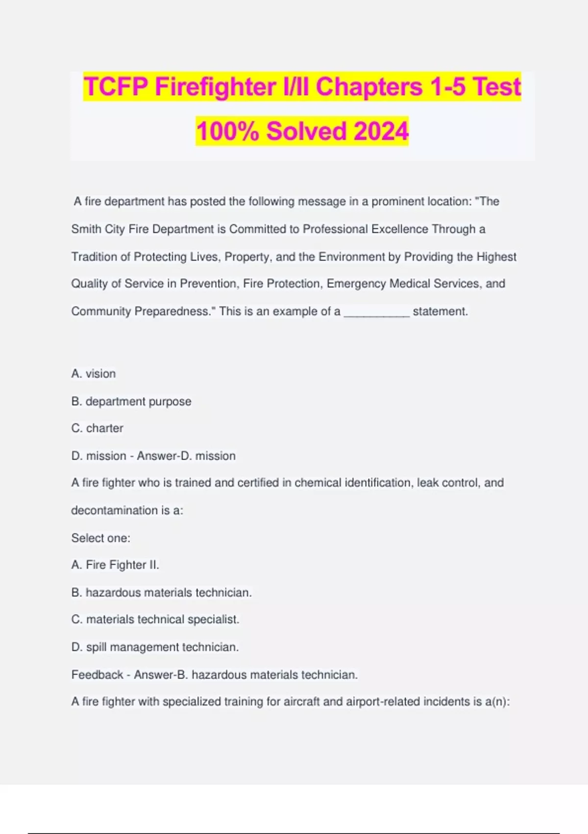 TCFP Firefighter I/II Chapters 1-5 Test 100% Solved 2024 A fire department has posted the following message in a prominent location: "The Smith City Fire Department is Committed to Professional Excellence Through a Tradition of Protecting Lives, Property, and the Environment by Providing the Highest Quality of Service in Prevention, Fire Protection, Emergency Medical Services, and Community Preparedness." This is an example of a __________ statement. A. vision B. department purpose C. charter D. mission - Answer-D. mission A fire fighter who is trained and certified in chemical identification, leak control, and decontamination is a: Select one: A. Fire Fighter II. B. hazardous materials technician. C. materials technical specialist. D. spill management technician. Feedback - Answer-B. hazardous materials technician. A fire fighter with specialized training for aircraft and airport-related incidents is a(n): Select one: A. aircraft rescue fire fighter. B. technical rescue technician. C. aviation rescue technician. D. aviation operations specialist. - Answer-A. aircraft rescue fire fighter. What is the name of the agency that the Texas Commission on Fire Protection accreditation falls under? Select one: A. NFPA - National Fire Protection Agency B. IFSAC - International Fire Service Accreditation Congress C. IFSTA - International Fire Training Association D. OSHA - Occupational Safety Health Administration - Answer-B. IFSAC - International Fire Service Accreditation Congress Texas Commission on Fire Protection certification testing consist of two parts. One being your Verification Skills and the other being the TCFP Written Exam. TCFP written exam is scheduled Fast Track Skills Session on 13th day and for the Saturday Session Skills the written exam is scheduled on a week day after last Saturday Session. For both classes when is the Verification Skills Sessions given? Select one: a. Verification Skills will only be given on scheduled burn days only. b. Verification Skills Testing are completed during 12 day Skills Session days. c. Verification Skills are competed on last day of Skills Session for both Saturday or Fast Track. d. Verification Skills are scheduled when student is ready. - Answer-b. Verification Skills Testing are completed during 12 day Skills Session days. The TCFP Written Exam is broken down into 4 categories, that are your IFSAC Seals what are they? Select one: a. Firefighter 1, Firefighter 2, Hazardous Materials Awareness, Hazardous Materials Operations. b. Firefighter 1, Firefighter 2, Driver Operator, Hazardous Materials Operations c. Firefighter, Hazardous Materials Operations, Hazardous Materials Awareness, Driver Operator d. Firefighter 1, Firefighter 2, Firefighter 3 and Hazards Materials Operations. - Answer- a. Firefighter 1, Firefighter 2, Hazardous Materials Awareness, Hazardous Materials Operations. If you fail TCFP Written Exam, how many days do you schedule your re-test? Select one: a. 14 days b. 365 days c. 12 days d. 180 days - Answer-d. 180 days Passing our course and TCFP Exams does not mean you are automatically certified. You must apply for TCFP Certification and IFSAC Seals if desired and eligible. Steps to becoming a certified firefighter is listed on TCFP Website. Their is an expiration on your