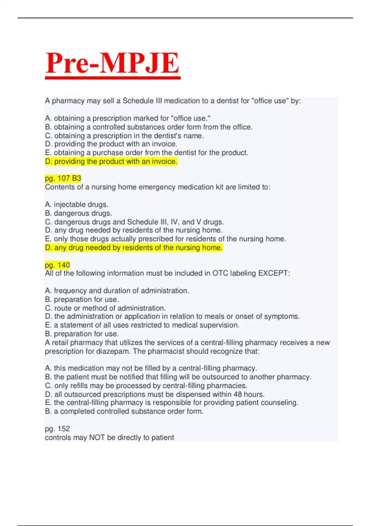 Contents of a nursing home emergency medication kit are limited to: A. injectable drugs. B. dangerous drugs. C. dangerous drugs and Schedule III, IV, and V drugs. D. any drug needed by residents of the nursing home. E. only those drugs actually prescribed for residents of the nursing home. D. any drug needed by residents of the nursing home. pg. 140 All of the following information must be included in OTC labeling EXCEPT: A. frequency and duration of administration. B. preparation for use. C. route or method of administration. D. the administration or application in relation to meals or onset of symptoms. E. a statement of all uses restricted to medical supervision.
