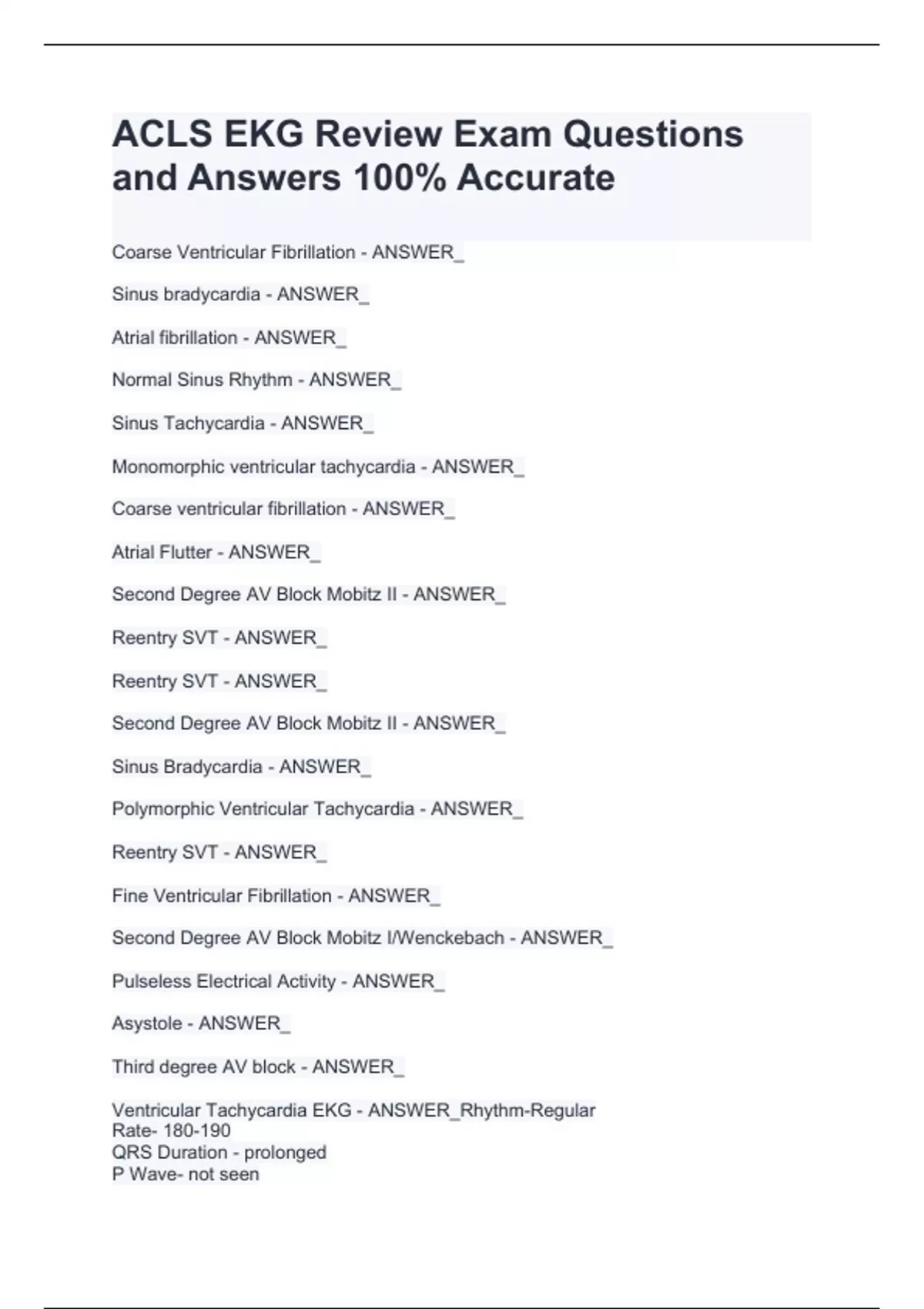 Sinus bradycardia - ANSWER_ Atrial fibrillation - ANSWER_ Normal Sinus Rhythm - ANSWER_ Sinus Tachycardia - ANSWER_ Monomorphic ventricular tachycardia - ANSWER_ Coarse ventricular fibrillation - ANSWER_ Atrial Flutter - ANSWER_ Second Degree AV Block Mobitz II - ANSWER_ Reentry SVT - ANSWER_ Reentry SVT - ANSWER_ Second Degree AV Block Mobitz II - ANSWER_ Sinus Bradycardia - ANSWER_ Polymorphic Ventricular Tachycardia - ANSWER_ Reentry SVT - ANSWER_ Fine Ventricular Fibrillation - ANSWER_ Second Degree AV Block Mobitz I/Wenckebach - ANSWER_ Pulseless Electrical Activity - ANSWER_ Asystole - ANSWER_ Third degree AV block - ANSWER_ Ventricular Tachycardia EKG - ANSWER_Rhythm-Regular Rate- 180-190 QRS Duration - prolonged P Wave- not seen