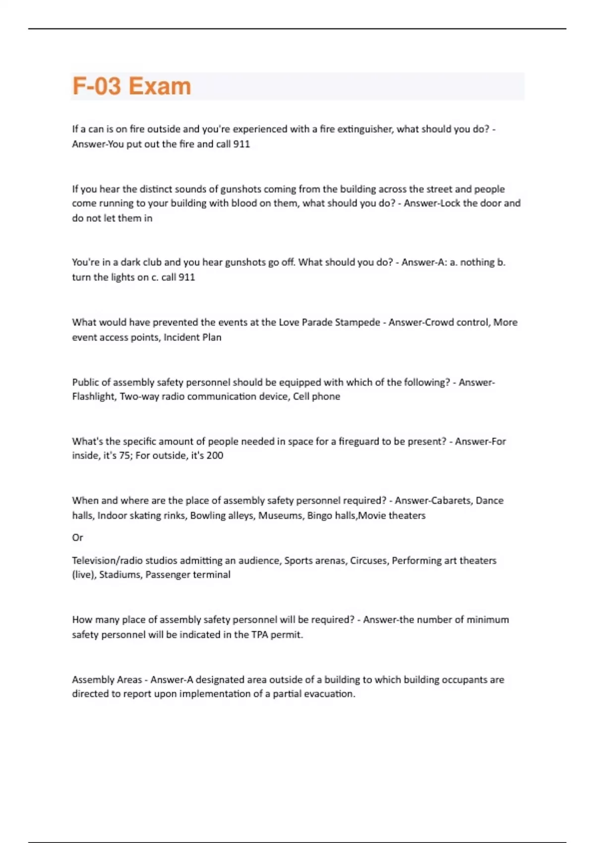 If a can is on fire outside and you're experienced with a fire extinguisher, what should you do? - Answer-You put out the fire and call 911 If you hear the distinct sounds of gunshots coming from the building across the street and people come running to your building with blood on them, what should you do? - Answer-Lock the door and do not let them in You're in a dark club and you hear gunshots go off. What should you do? - Answer-A: a. nothing b. turn the lights on c. call 911 What would have prevented the events at the Love Parade Stampede - Answer-Crowd control, More event access points, Incident Plan Public of assembly safety personnel should be equipped with which of the following? - AnswerFlashlight, Two-way radio communication device, Cell phone What's the specific amount of people needed in space for a fireguard to be present? - Answer-For inside, it's 75; For outside, it's 200 When and where are the place of assembly safety personnel required? - Answer-Cabarets, Dance halls, Indoor skating rinks, Bowling alleys, Museums, Bingo halls,Movie theaters Or Television/radio studios admitting an audience, Sports arenas, Circuses, Performing art theaters (live), Stadiums, Passenger terminal How many place of assembly safety personnel will be required? - Answer-the number of minimum safety personnel will be indicated in the TPA permit. Assembly Areas - Answer-A designated area outside of a building to which building occupants are directed to report upon implementation of a partial evacuation.Building Information Card - Answer-The commissioner may require by rule the preparation of a building information card depicting and/or setting forth the relevant fire safety information for a building. Building Occupants - Answer-All persons in the building, including employees, building personnel and visitors