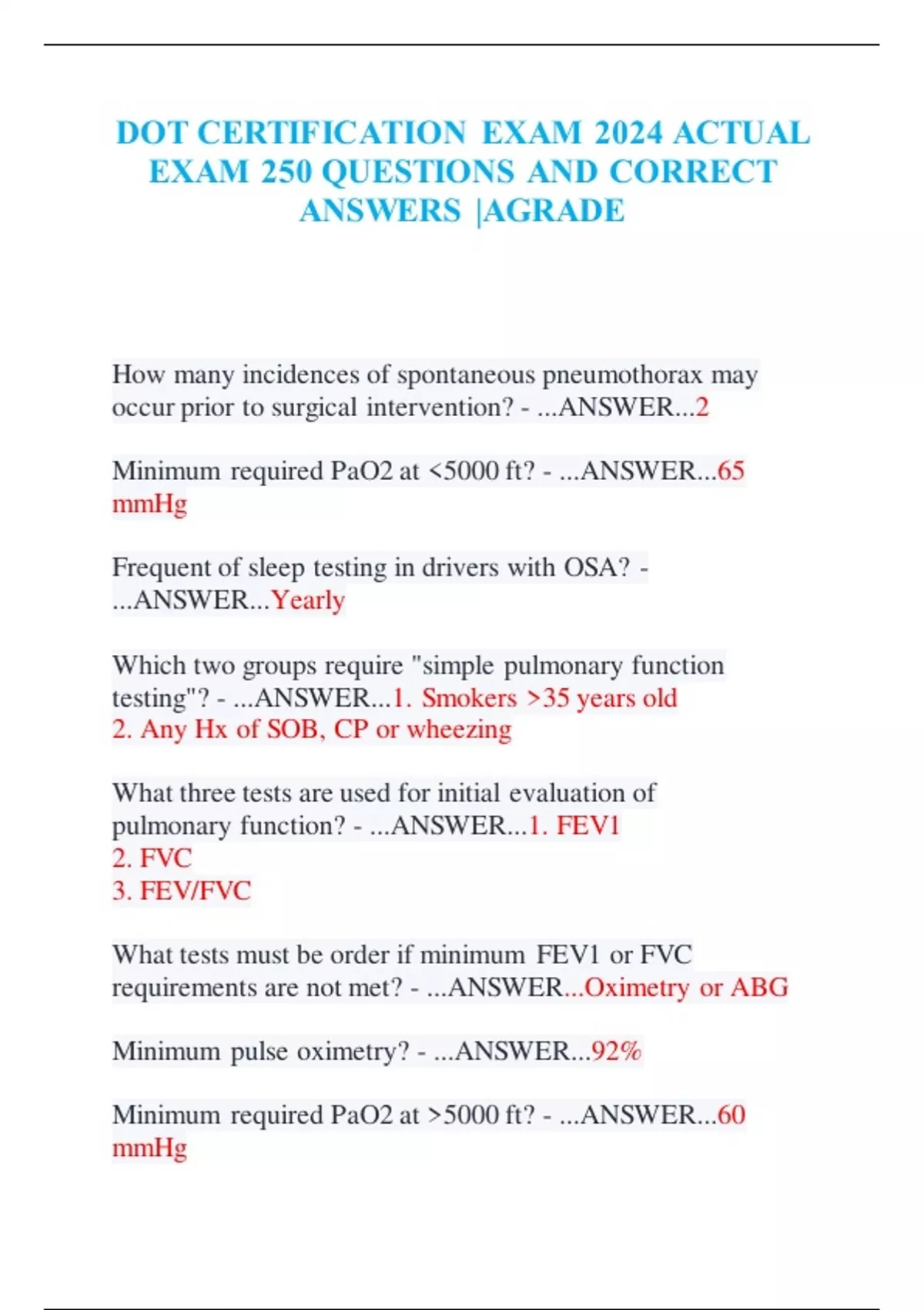 DOT CERTIFICATION EXAM 2024 ACTUAL EXAM 250 QUESTIONS AND CORRECT ANSWERS |AGRADE