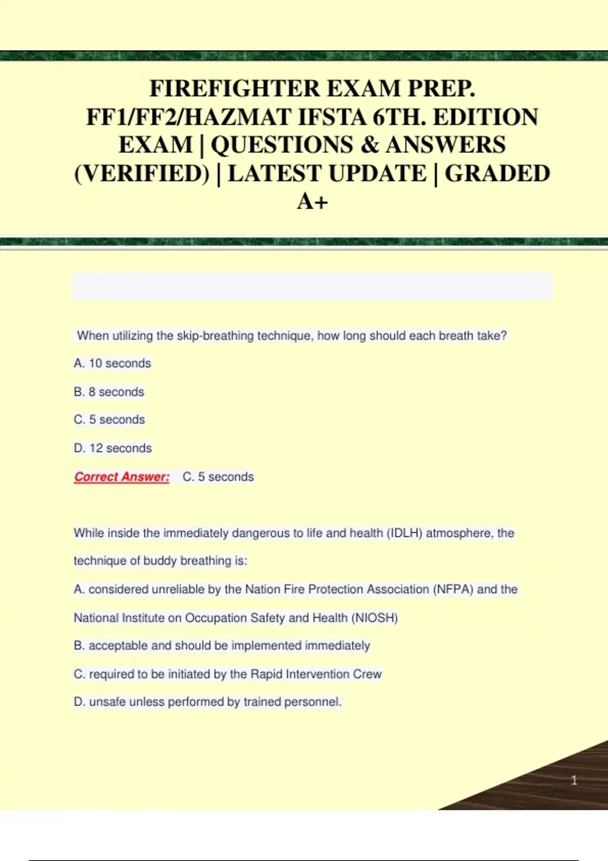 FIREFIGHTER EXAM PREP. FF1/FF2/HAZMAT IFSTA 6TH. EDITION EXAM | QUESTIONS & ANSWERS (VERIFIED) | LATEST UPDATE | GRADED A+FIREFIGHTER EXAM PREP. FF1/FF2/HAZMAT IFSTA 6TH. EDITION EXAM | QUESTIONS & ANSWERS (VERIFIED) | LATEST UPDATE | GRADED A+