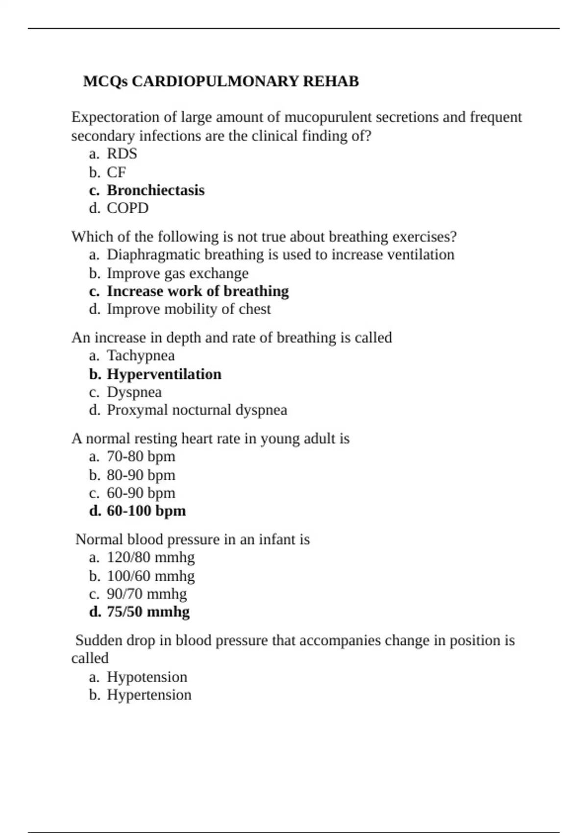 MCQs CARDIOPULMONARY REHAB Expectoration of large amount of mucopurulent secretions and frequent secondary infections are the clinical finding of? a. RDS b. CF c. Bronchiectasis d. COPD Which of the following is not true about breathing exercises? a. Diaphragmatic breathing is used to increase ventilation b. Improve gas exchange c. Increase work of breathing d. Improve mobility of chest An increase in depth and rate of breathing is called a. Tachypnea b. Hyperventilation c. Dyspnea d. Proxymal nocturnal dyspnea A normal resting heart rate in young adult is a. 70-80 bpm b. 80-90 bpm c. 60-90 bpm d. 60-100 bpm Normal blood pressure in an infant is a. 120/80 mmhg b. 100/60 mmhg c. 90/70 mmhg d. 75/50 mmhg Sudden drop in blood pressure that accompanies change in position is called a. Hypotension b. Hypertension