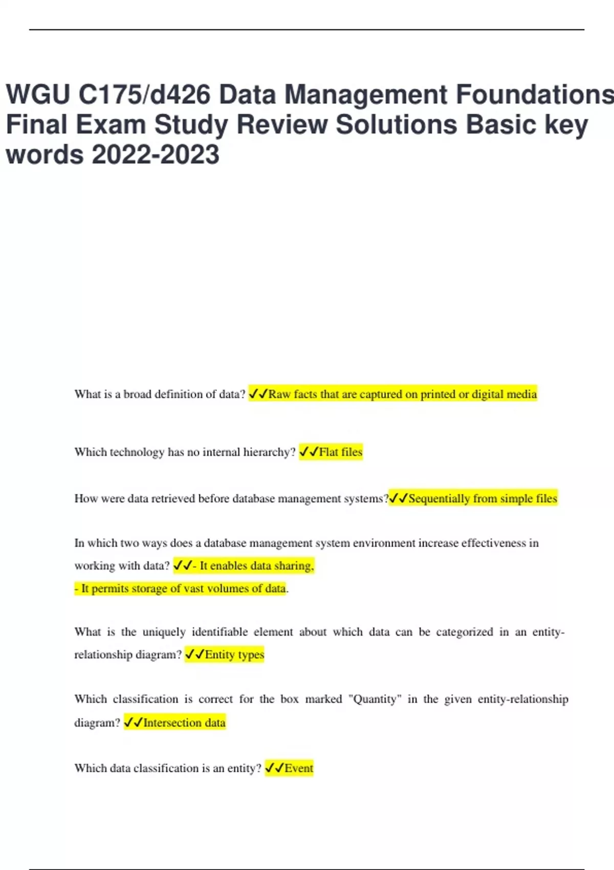 WGU C175/d426 Data Management Foundations Final Exam Study Review Solutions Basic key words What is a broad definition of data? Raw facts that are captured on printed or digital media Which technology has no internal hierarchy? Flat files How were data retrieved before database management systems?Sequentially from simple files In which two ways does a database management system environment increase effectiveness in working with data? - It enables data sharing, - It permits storage of vast volumes of data. What is the uniquely identifiable element about which data can be categorized in an entityrelationship diagram? Entity types Which classification is correct for the box marked "Quantity" in the given entity-relationship diagram? Intersection data Which data classification is an entity? Event A salesperson is authorized to sell 12 products; a product can be sold by 10 salespersons. Which kind of binary relationship is described in this example? Many-to-many Which three kinds of rules for referential integrity are provided by modern relational database management systems? Insert, Delete, Update What is an important aspect of "referential integrity"?Reference to data in one relation is based on values in another relation. Sales data, detailing the customer names, products sold, and salespersons, is kept in a database. Which kind of data in this database would qualify as intersection data related to both the product and salesperson entities? Customer names What is an attribute or group of attributes that uniquely identify a tuple in a relation? Primary key What is necessary for a primary key in one relation of a database to match with its corresponding foreign key in another relation of the same database? A domain of values What uniquely identifies each entity in a collection of entities but is not the primary key? The alternate key What is a term for a set of columns in a table that can uniquely identify any record in that table without referring to other data? Candidate key What happens to the original data in database indexing? It is copied to the index. Why are indexes created in a physical database design?To retrieve data directly using