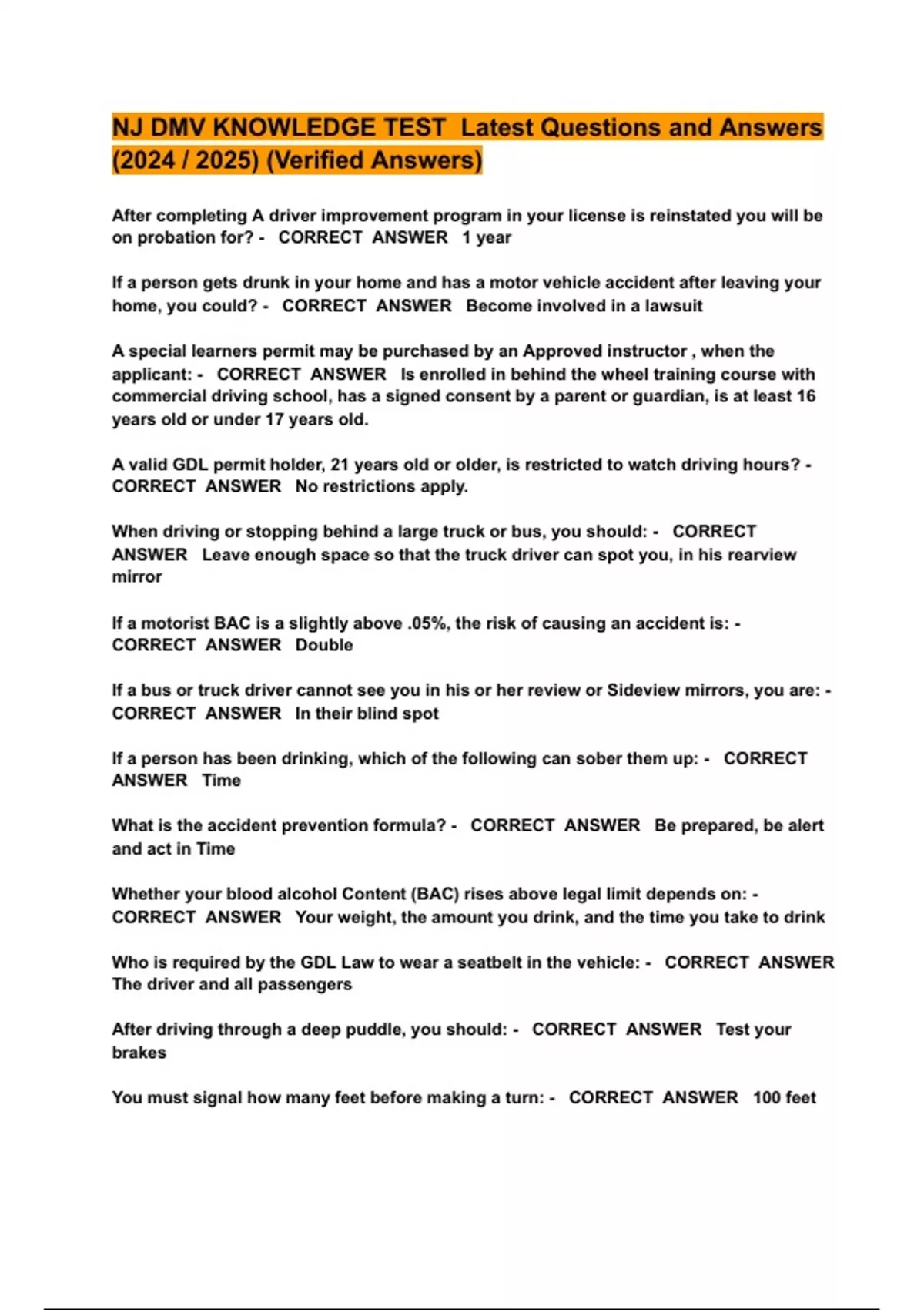 NJ DMV KNOWLEDGE TEST Latest Questions and Answers (2024 / 2025) (Verified Answers)