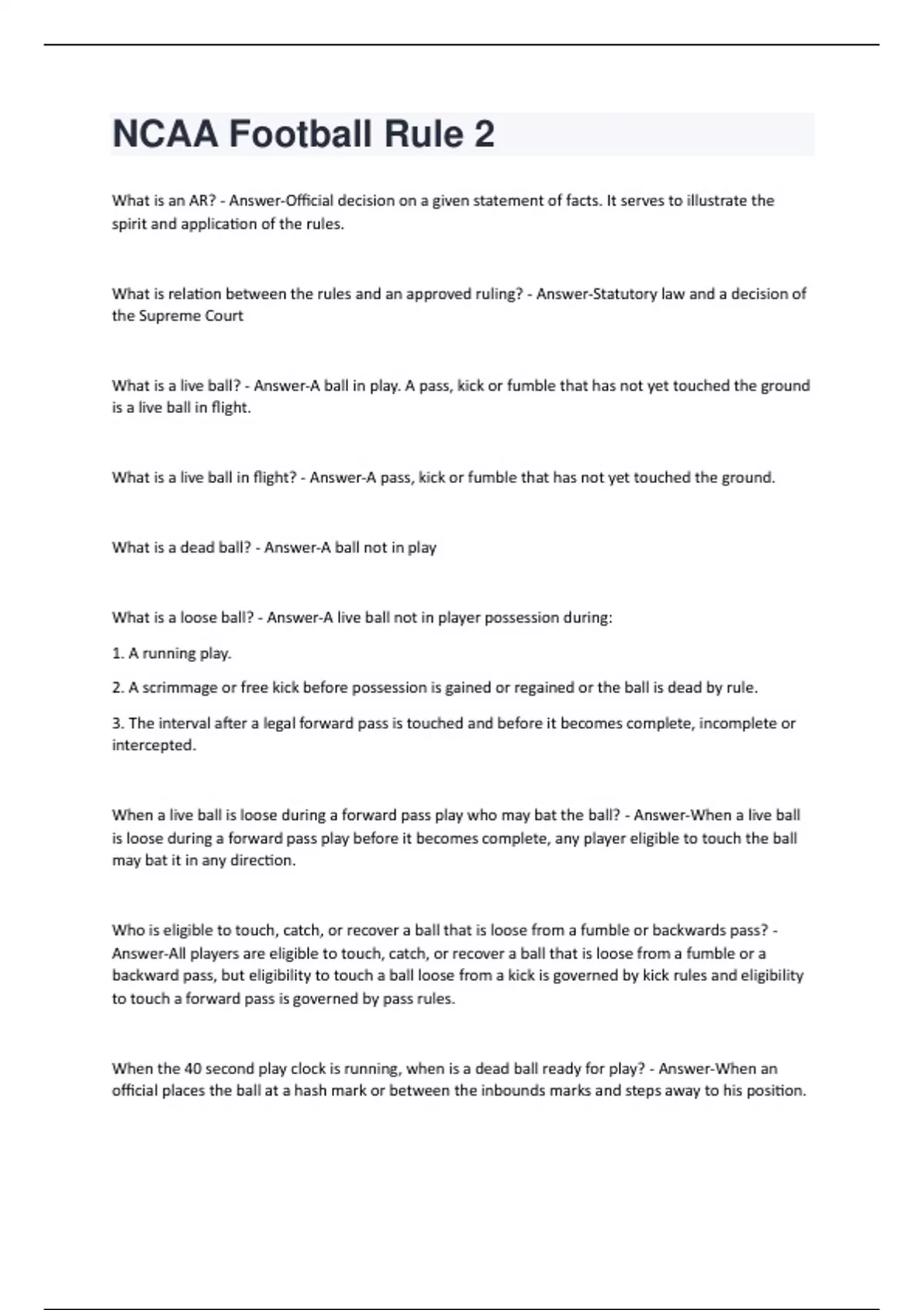 What is an AR? - Answer-Official decision on a given statement of facts. It serves to illustrate the spirit and application of the rules. What is relation between the rules and an approved ruling? - Answer-Statutory law and a decision of the Supreme Court What is a live ball? - Answer-A ball in play. A pass, kick or fumble that has not yet touched the ground is a live ball in flight. What is a live ball in flight? - Answer-A pass, kick or fumble that has not yet touched the ground. What is a dead ball? - Answer-A ball not in play What is a loose ball? - Answer-A live ball not in player possession during: 1. A running play. 2. A scrimmage or free kick before possession is gained or regained or the ball is dead by rule. 3. The interval after a legal forward pass is touched and before it becomes complete, incomplete or intercepted. When a live ball is loose during a forward pass play who may bat the ball? - Answer-When a live ball is loose during a forward pass play before it becomes complete, any player eligible to touch the ball may bat it in any direction. Who is eligible to touch, catch, or recover a ball that is loose from a fumble or backwards pass? - Answer-All players are eligible to touch, catch, or recover a ball that is loose from a fumble or a backward pass, but eligibility to touch a ball loose from a kick is governed by kick rules and eligibility to touch a forward pass is governed by pass rules. When the 40 second play clock is running, when is a dead ball ready for play? - Answer-When an official places the ball at a hash mark or between the inbounds marks and steps away to his position.When the play clock is set at 25 seconds, when is a dead ball ready for play? - Answer-When the referee sounds his whistle and either signals to start the game clock or signals that the ball is ready for play When the play clock is set at 40 seconds following an injury to a defensive team player, when is a dead ball ready for play? - Answer-When the referee sounds his whistle and either signals to start the game clock or signals that the ball is ready for play