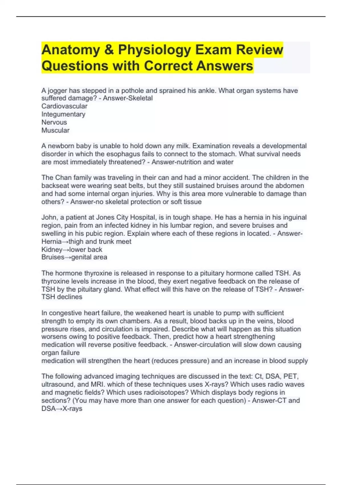 Anatomy & Physiology Exam Review Questions with Correct Answers A newborn is diagnosed with sickle cell anemia, a genetic disease in which substitution of one amino acid results in abnormal hemoglobin. Explain to the parents how the substitution can have such drastic effect on the structure of the protein. - Answer-oxygen will not bind (there will be a little oxygen in the blood) Johnny's body temperature is spiking upward. When it reaches 104 degrees, his mother puts in a call to the pediatrician. She is advised to give Johnny children's acetaminophen or ibuprofen and sponge his body with cool to tepid water to prevent a further rise in temperature. How might a fever (excessively high body temperature) be detrimental to Johnny's welfare? - Answer-if his body temperature becomes too hot (overheated) Mrs. Gallo's physician suspects that she is showing the initial signs of multiple sclerosis, a disease characterized by the formation of hardened plaques in the insulating sheaths surrounding nerve fibers. What medical imaging technique will the physician probably order to determine if such plaques are present? - Answer-serial magnetic resonance (MR)