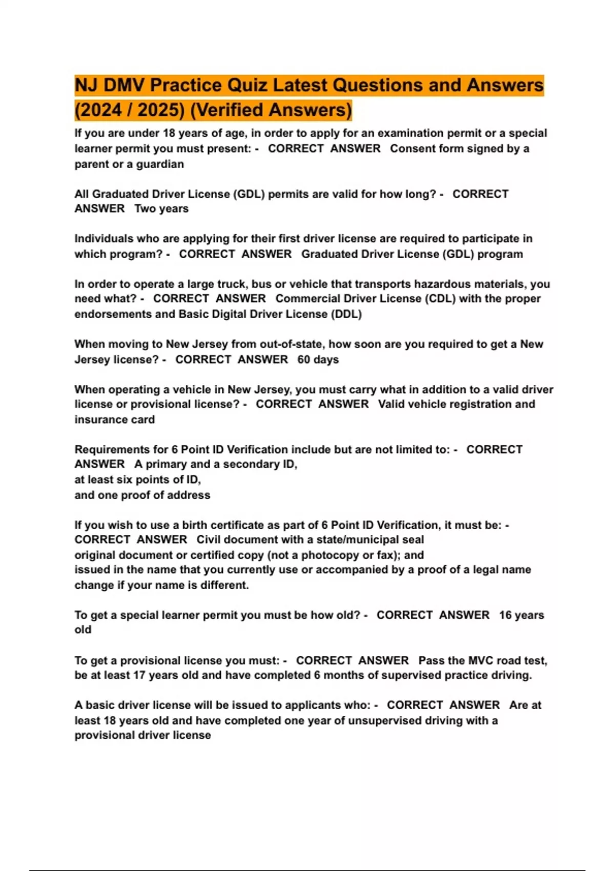 NJ DMV Practice Quiz Latest Questions and Answers (2024 / 2025) (Verified Answers)