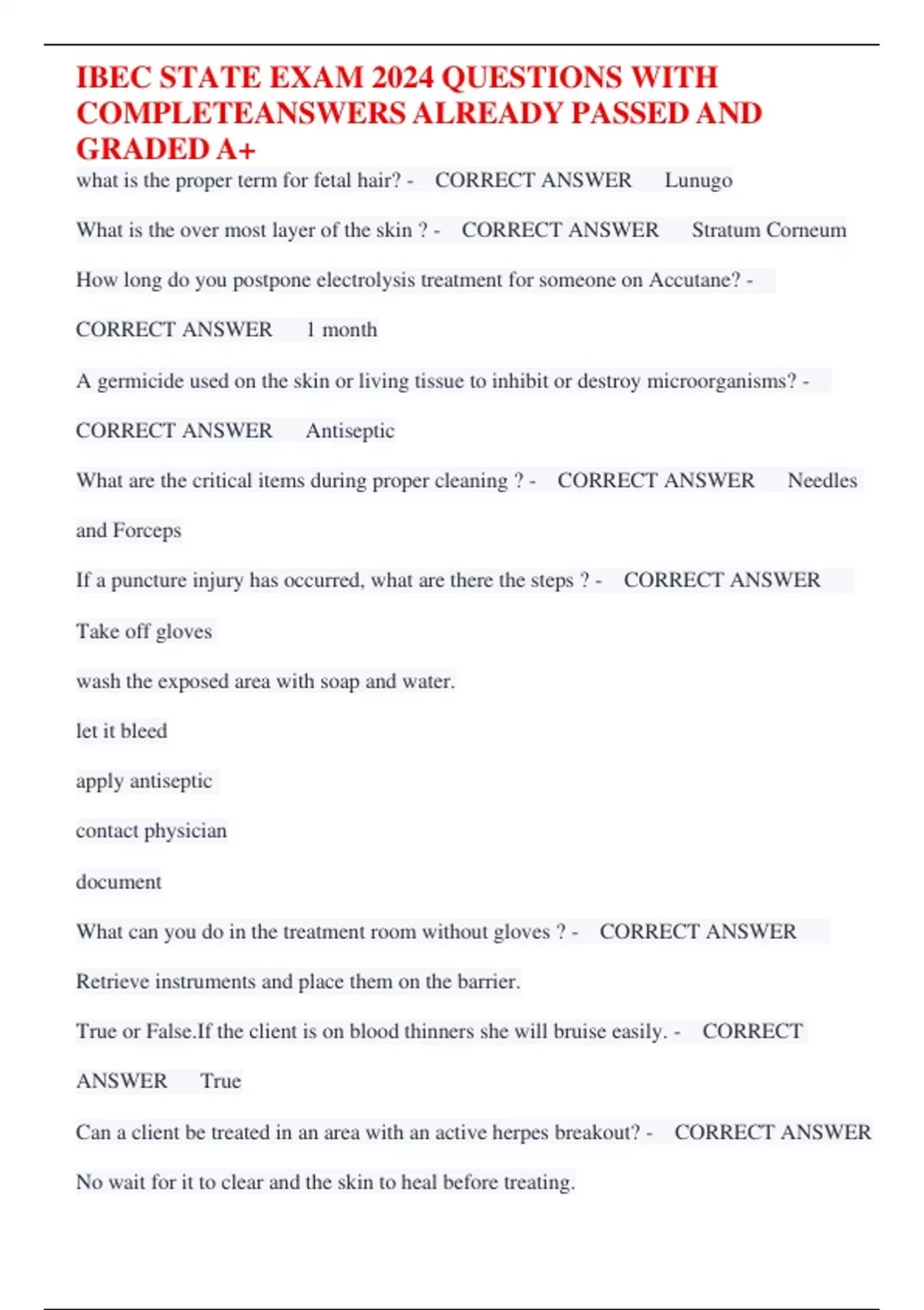 IBEC STATE EXAM 2024 QUESTIONS WITH COMPLETEANSWERS ALREADY PASSED AND GRADED A+ what is the proper term for fetal hair? - CORRECT ANSWER Lunugo What is the over most layer of the skin ? - CORRECT ANSWER Stratum Corneum How long do you postpone electrolysis treatment for someone on Accutane? - CORRECT ANSWER 1 month A germicide used on the skin or living tissue to inhibit or destroy microorganisms? - CORRECT ANSWER Antiseptic What are the critical items during proper cleaning ? - CORRECT ANSWER Needles and Forceps If a puncture injury has occurred, what are there the steps ? - CORRECT ANSWER Take off gloves wash the exposed area with soap and water. let it bleed apply antiseptic contact physician document What can you do in the treatment room without gloves ? - CORRECT ANSWER Retrieve instruments and place them on the barrier. True or False.If the client is on blood thinners she will bruise easily. - CORRECT ANSWER True Can a client be treated in an area with an active herpes breakout? - CORRECT ANSWER No wait for it to clear and the skin to heal before treating. IBEC STATE EXAM 2024 QUESTIONS WITH COMPLETEANSWERS ALREADY PASSED AND GRADED A+ What is the medication a client should take prior to a treatment if they are prone to cold sores? - CORRECT ANSWER Valtrex Do you need written permission from a physician to preform an electrolysis on someone with a pacemaker? - CORRECT ANSWER Yes Can you refuse a patient with contagious blood disease such as HIV? - CORRECT ANSWER No it is against the law What type of diabetes is diagnosed in some women during pregnancy? - CORRECT ANSWER Gestational what is the number one way to prevent the spread of disease? - CORRECT ANSWER Wash your hands If a client with a high pain tolerance is very persistent wants to treat her entire upper lip in one session what should the electrologist do? - CORRECT ANSWER Advise the client to break the entire upper lip area into different sessions to prevent over treatment. What is hair depth? - CORRECT ANSWER The distance from the surface of the epidermis to the bottom of the hair bulb. What is a needle cap holder ? - CORRECT ANSWER The plastic cap that holds the shaft of the needle in place on the needle cord. What are the semi critical items during proper cleaning procedures? - CORRECT ANSWER cataphoresis roller and needle cap what are the order of events for preparing for a treatment? - CORRECT ANSWER *wipe down surfaces IBEC STATE EXAM 2024 QUESTIONS WITH COMPLETEANSWERS ALREADY PASSED AND GRADED A+ *decontaminate hands *protect episode;ator,cart and treatment table surfaces with appropriately-sized and types of barrier. *wash hands *retrieve instruments and place them on the barrier * put on gloves A case history provides you with what ? - CORRECT ANSWER *Personal and medical information *Marketing results *permanent documentation *accurate and complete doc of the area treated. *information to assist in proper scheduling of appts. *medical approval if necessary. *clients goals and areas to be worked on. *clients signature for after treatment,medical info being correct, and issues of electrolyisis and permanency was discussed. What are the six contraindicated posture and positioning profiles for the electrologist? - CORRECT ANSWER 1. torso twist d shoulders tory light positioned away from the clinicians sight line for maxillary treatment