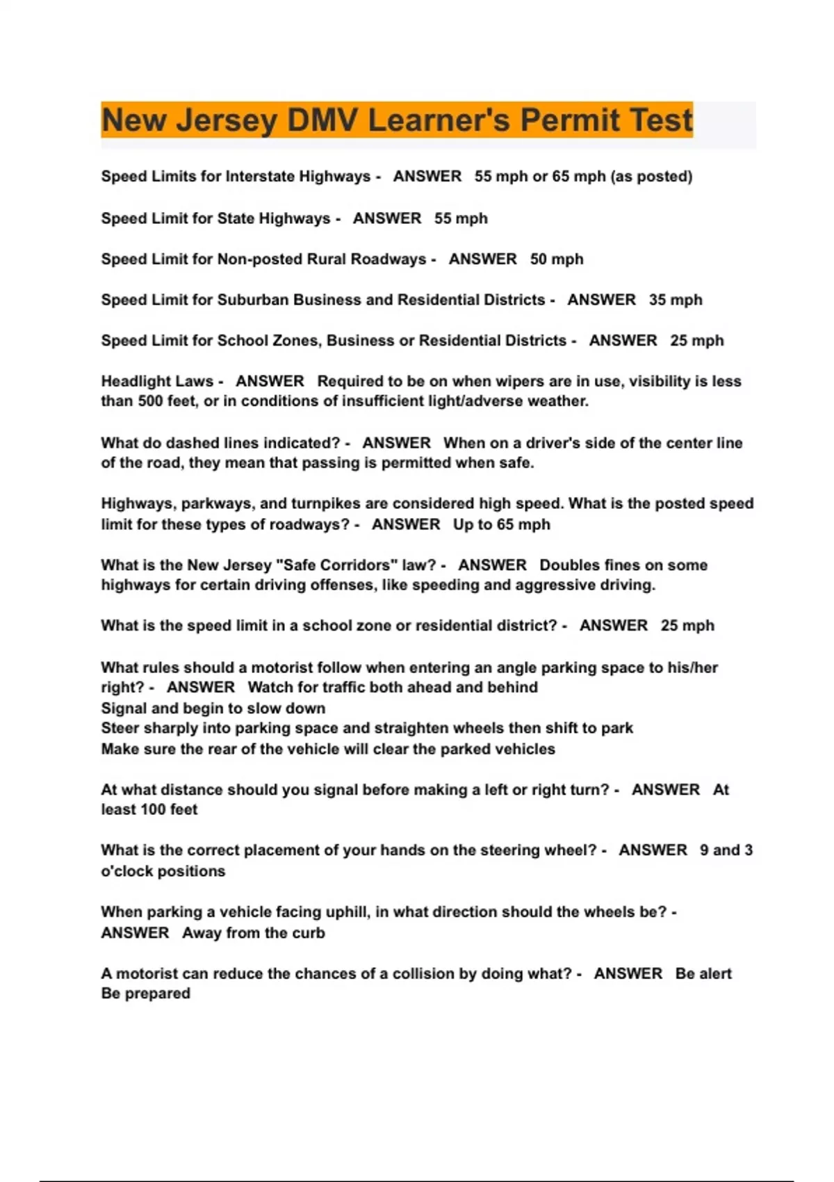 New Jersey DMV Learner's Permit Test Questions and Answers (2024 / 2025) (Verified Answers)