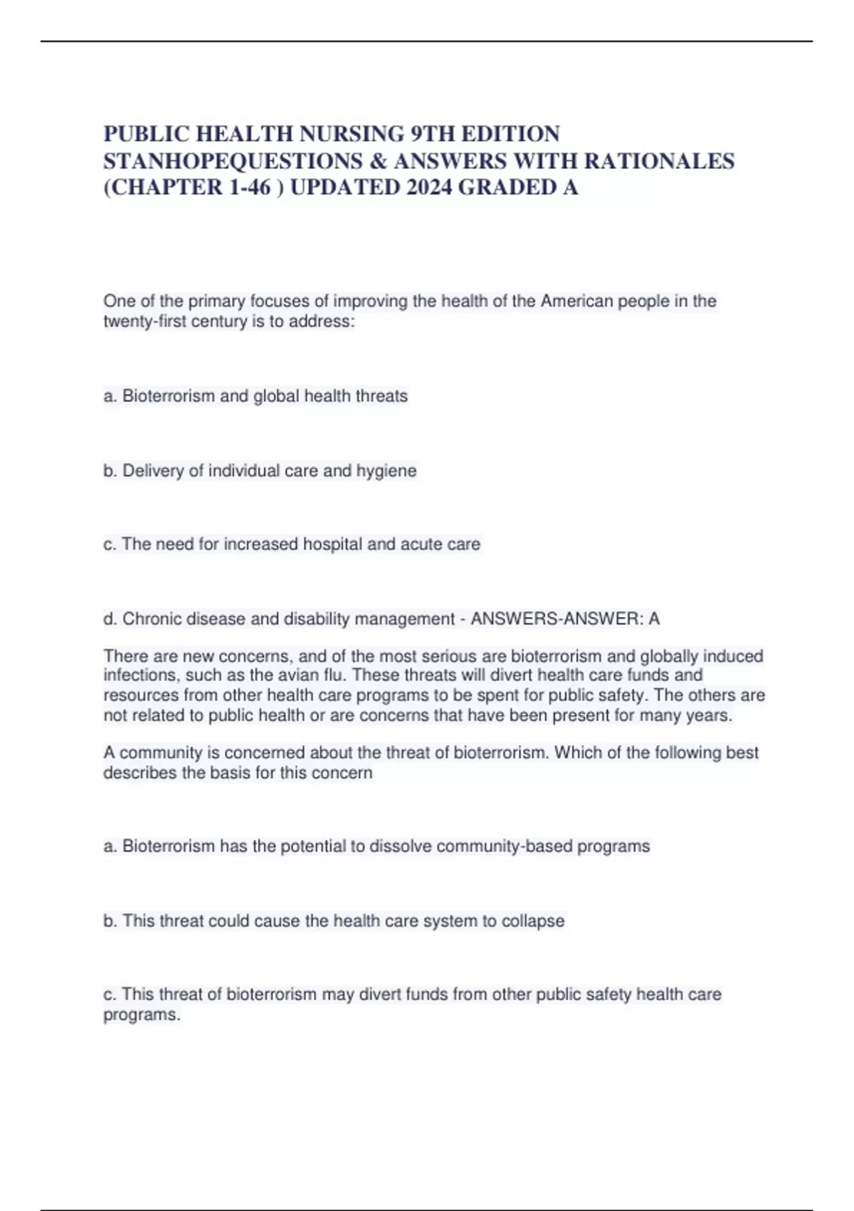 PUBLIC HEALTH NURSING 9TH EDITION STANHOPEQUESTIONS & ANSWERS WITH RATIONALES (CHAPTER 1-46 ) UPDATED 2024 GRADED A