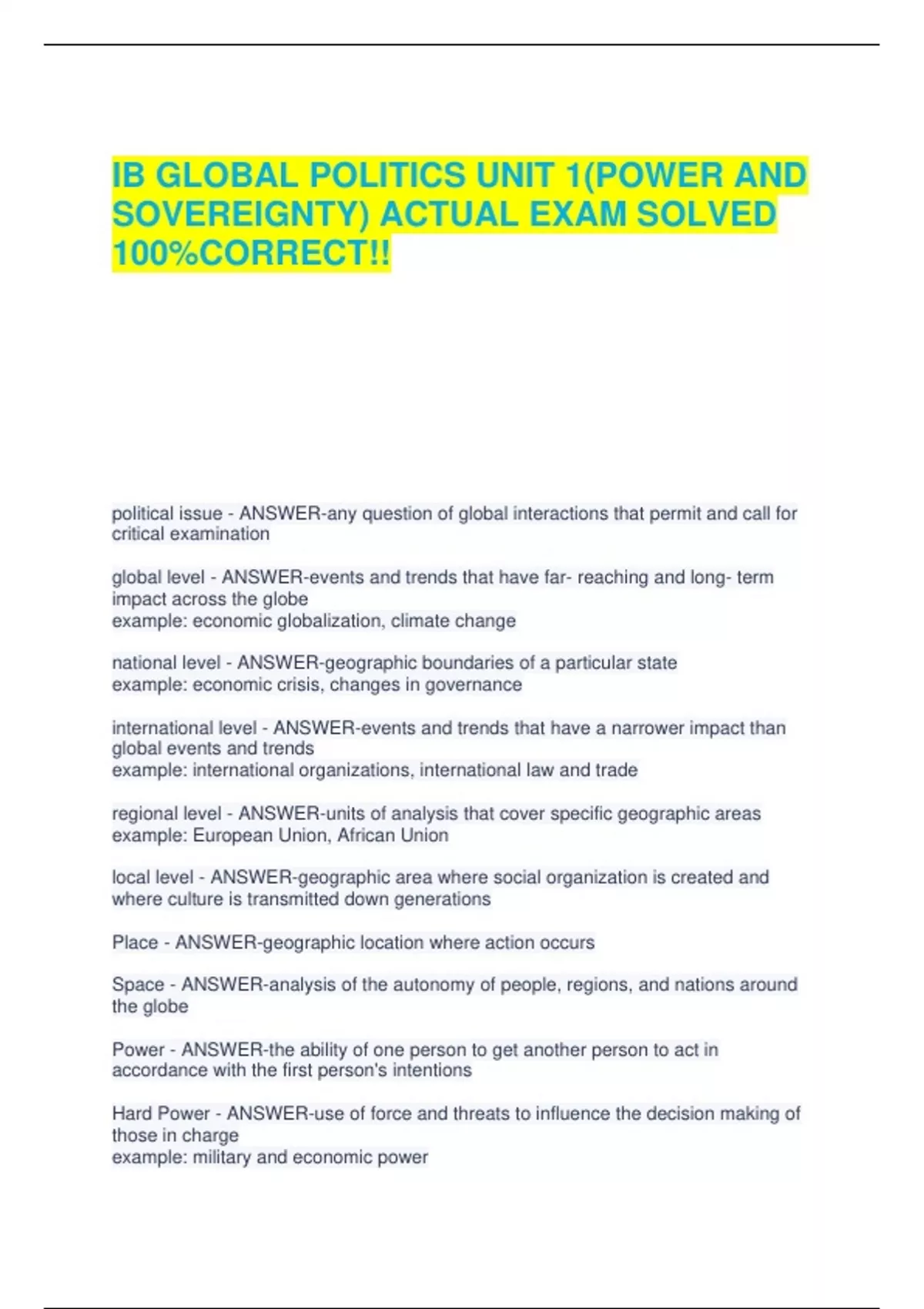 IB GLOBAL POLITICS UNIT 1(POWER AND SOVEREIGNTY) ACTUAL EXAM SOLVED 100%CORRECT!!
